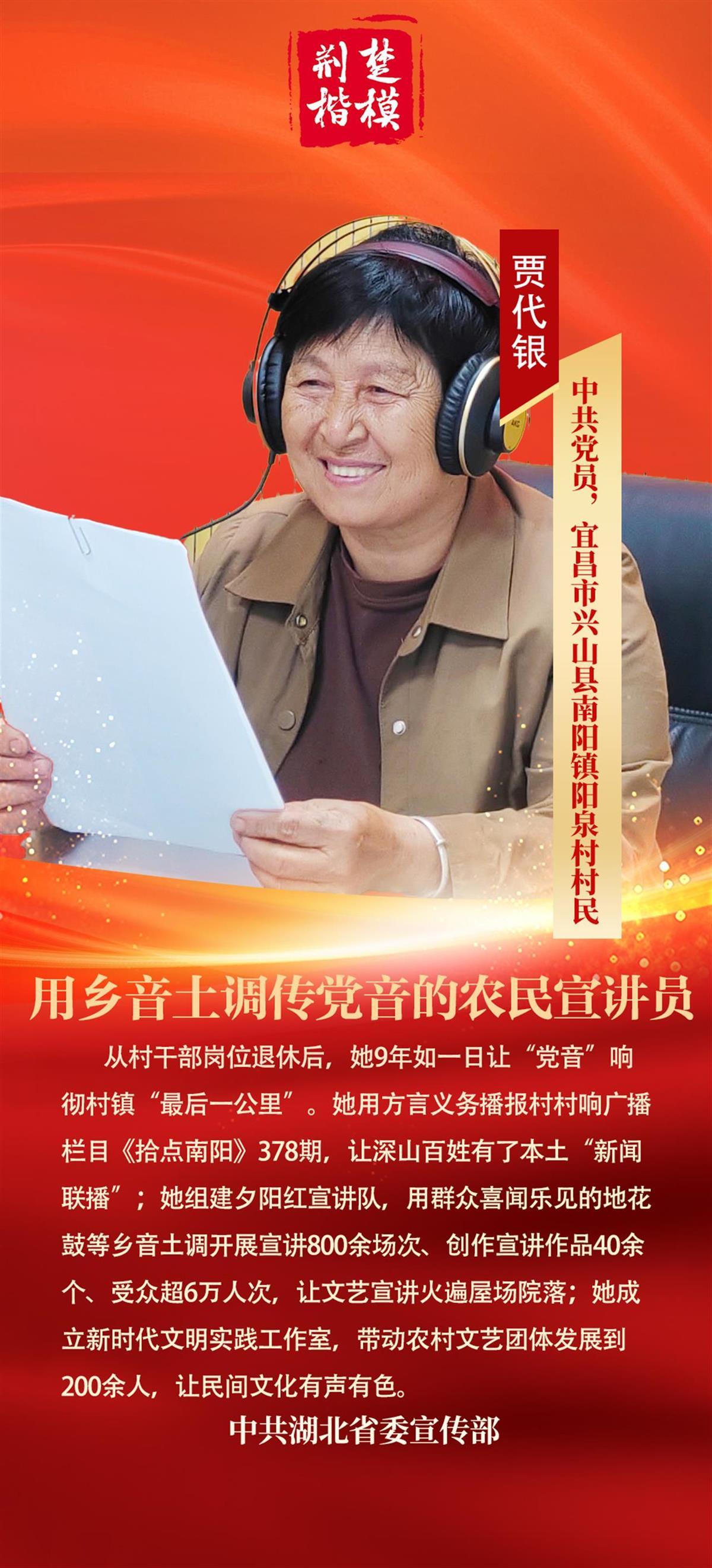 从村干部岗位退休后,她9年如一日让“党音”响彻村镇“最后一公里”。她用方言义务播报村村响广播栏目《拾点南阳》378期,让深山百姓有了本土“新闻联播”;她组建夕阳红宣讲队,用群众喜闻乐见的地花鼓等乡音土调开展宣讲800余场次、创作宣讲作品40余个、受众超6万人次,让文艺宣讲火遍屋场院落;她成立新时代文明实践工作室,带动农村文艺团体发展到200余人,让民间文化有声有色。