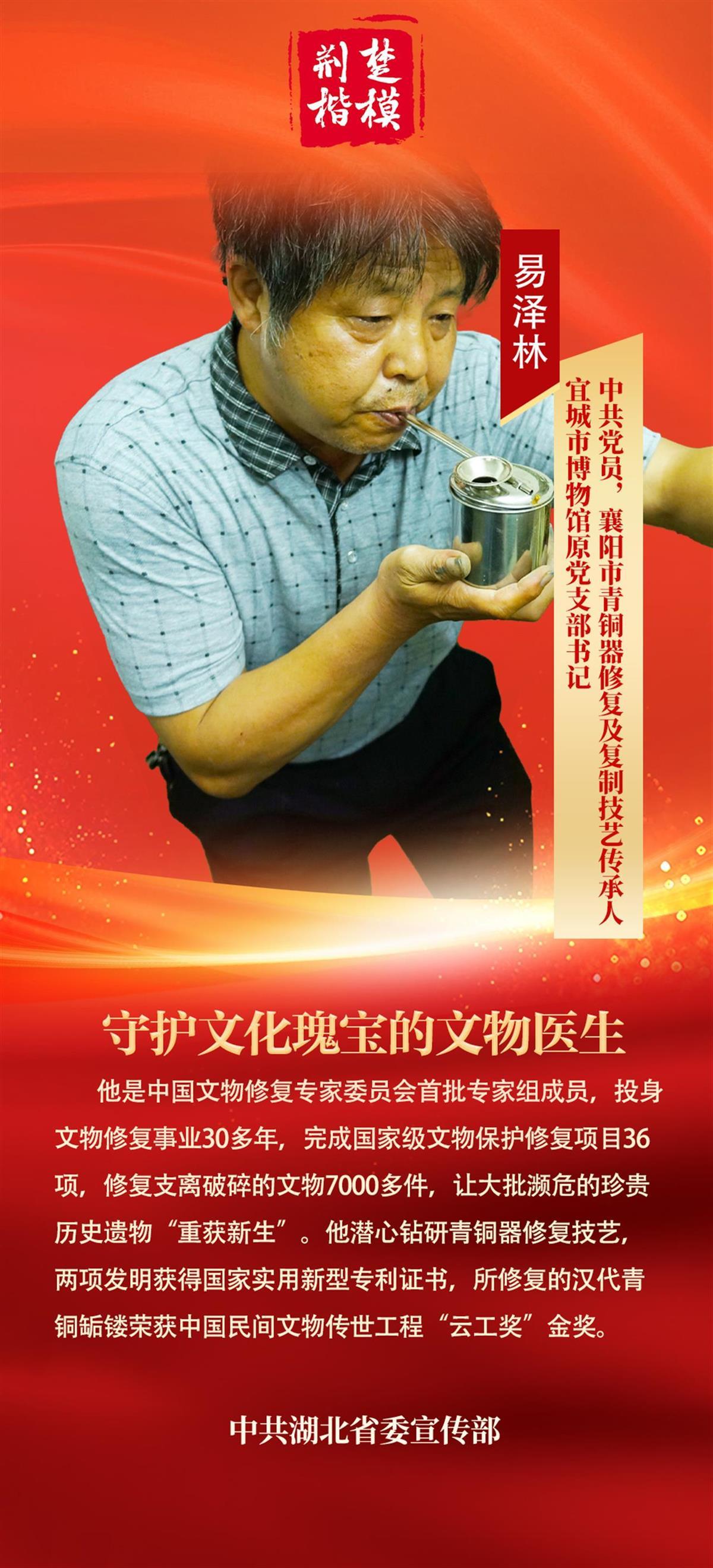 他是中国文物修复专家委员会首批专家组成员,投身文物修复事业30多年,完成国家级文物保护修复项目36项,修复支离破碎的文物7000多件,让大批濒危的珍贵历史遗物“重获新生”。他潜心钻研青铜器修复技艺,两项发明获得国家实用新型专利证书,所修复的汉代青铜缿镂荣获中国民间文物传世工程“云工奖”金奖。他先后荣获“中国传统工艺大师”“湖北省民间工艺技能传承大师”“湖北省技能大师”“荆楚工匠”等称号,享受“国务院政府特殊津贴”。