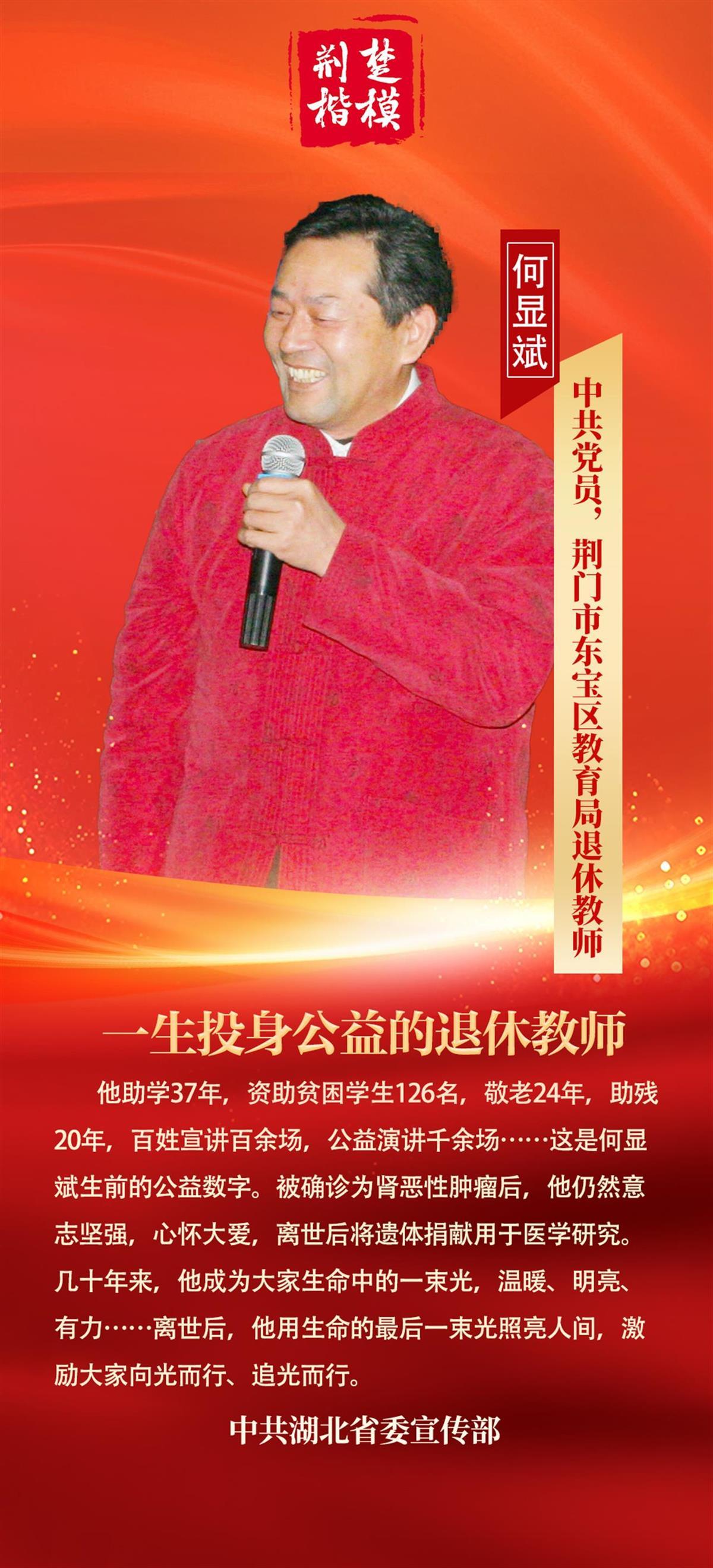 他助学37年,资助贫困学生126名,敬老24年,助残20年,百姓宣讲百余场,公益演讲千余场……这是何显斌生前的公益数字。被确诊为肾恶性肿瘤后,他仍然意志坚强,心怀大爱,离世后将遗体捐献用于医学研究。几十年来,他成为大家生命中的一束光,温暖、明亮、有力……离世后,他用生命的最后一束光照亮人间,激励大家向光而行、追光而行。