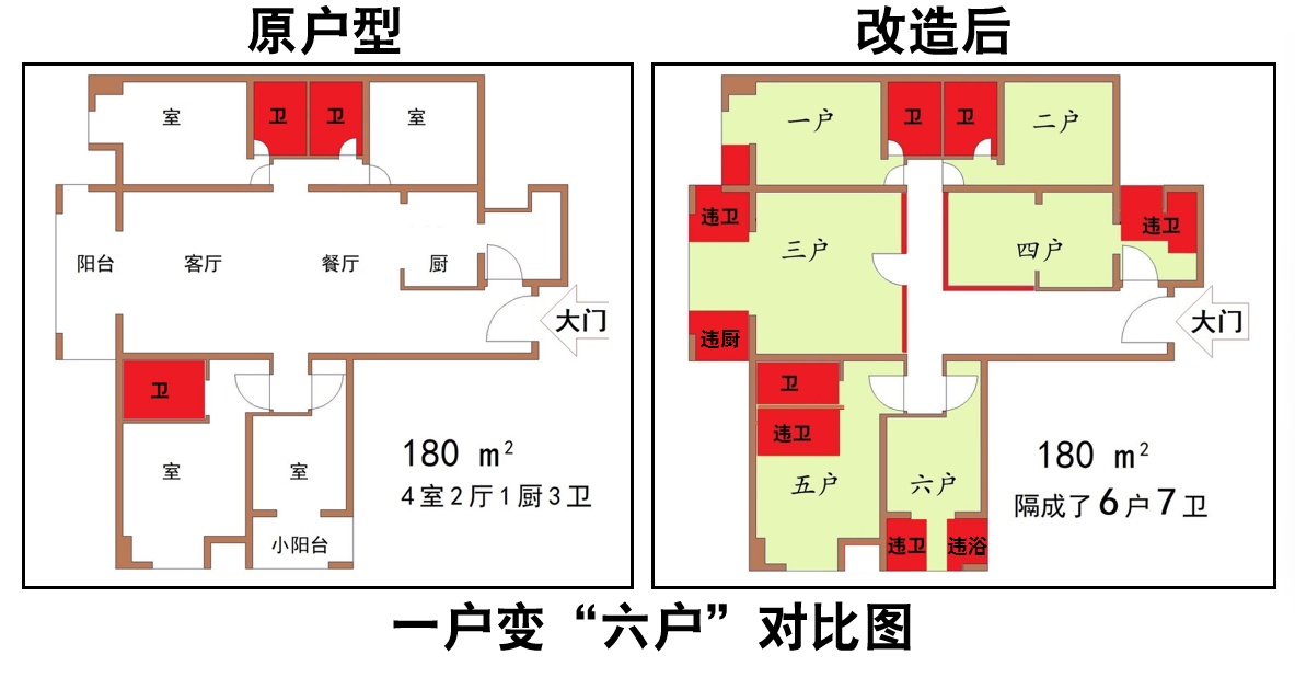 丁女士认为这属于“胶囊房”,居委会遂要求“二房东”整改。8月1日、9月29日,居委会通知丁女士上楼查看整改情况,她发现变动都不大,还观察到主卧室的主卫被改扩成并排的双卫,这样,6个房间就有7个厕所。