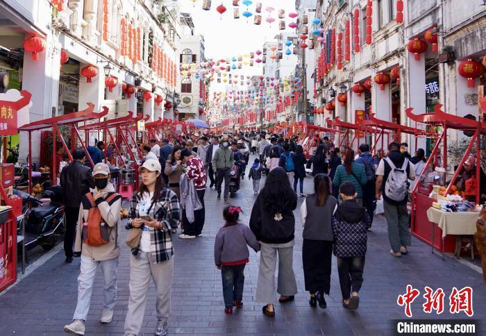 1月12日,海南海口骑楼老街“年味”十足,游人如织。春节临近,海口骑楼老街装点一新,吸引各地游客前来感受侨乡年味。 中新社发 陈英清 摄