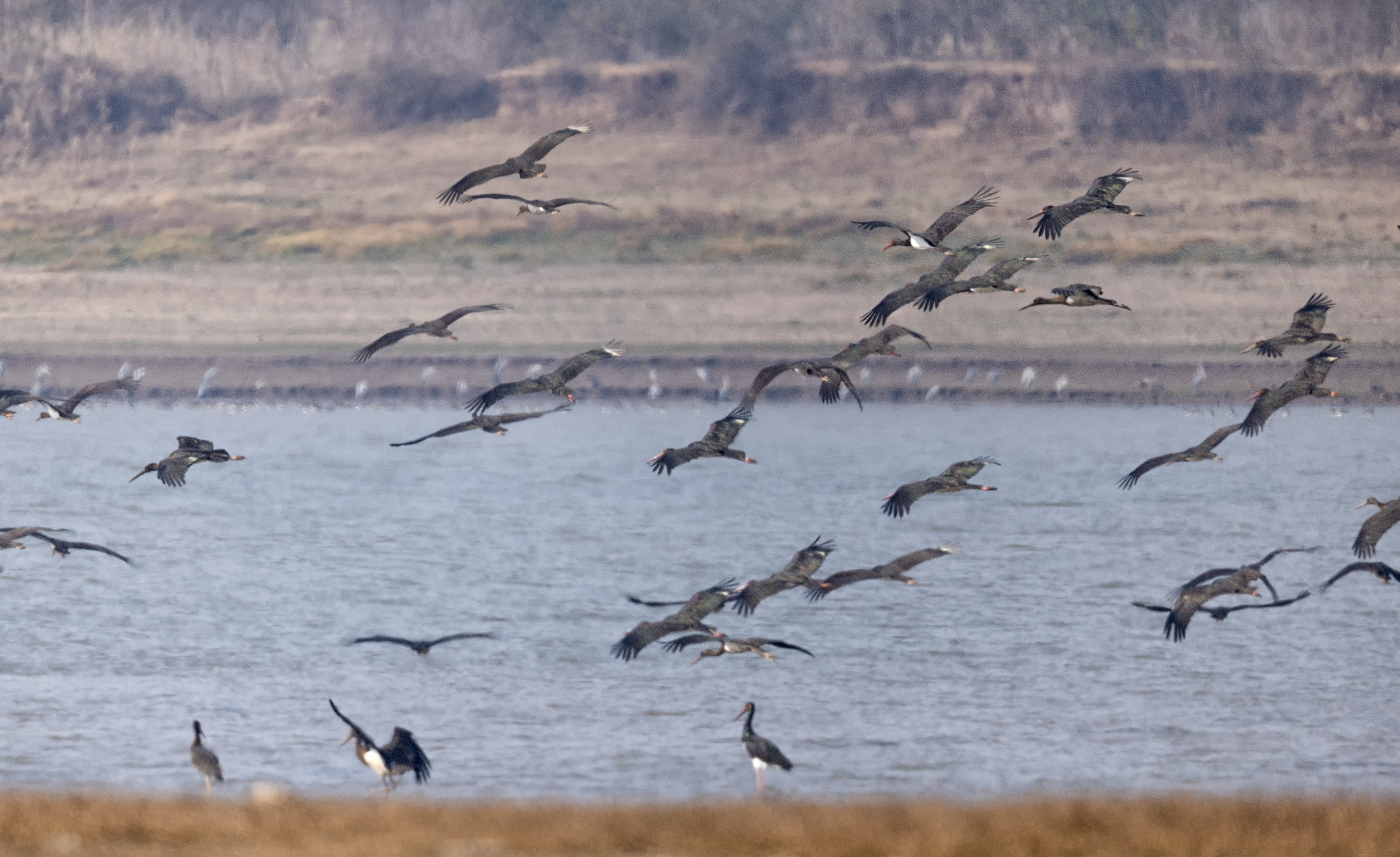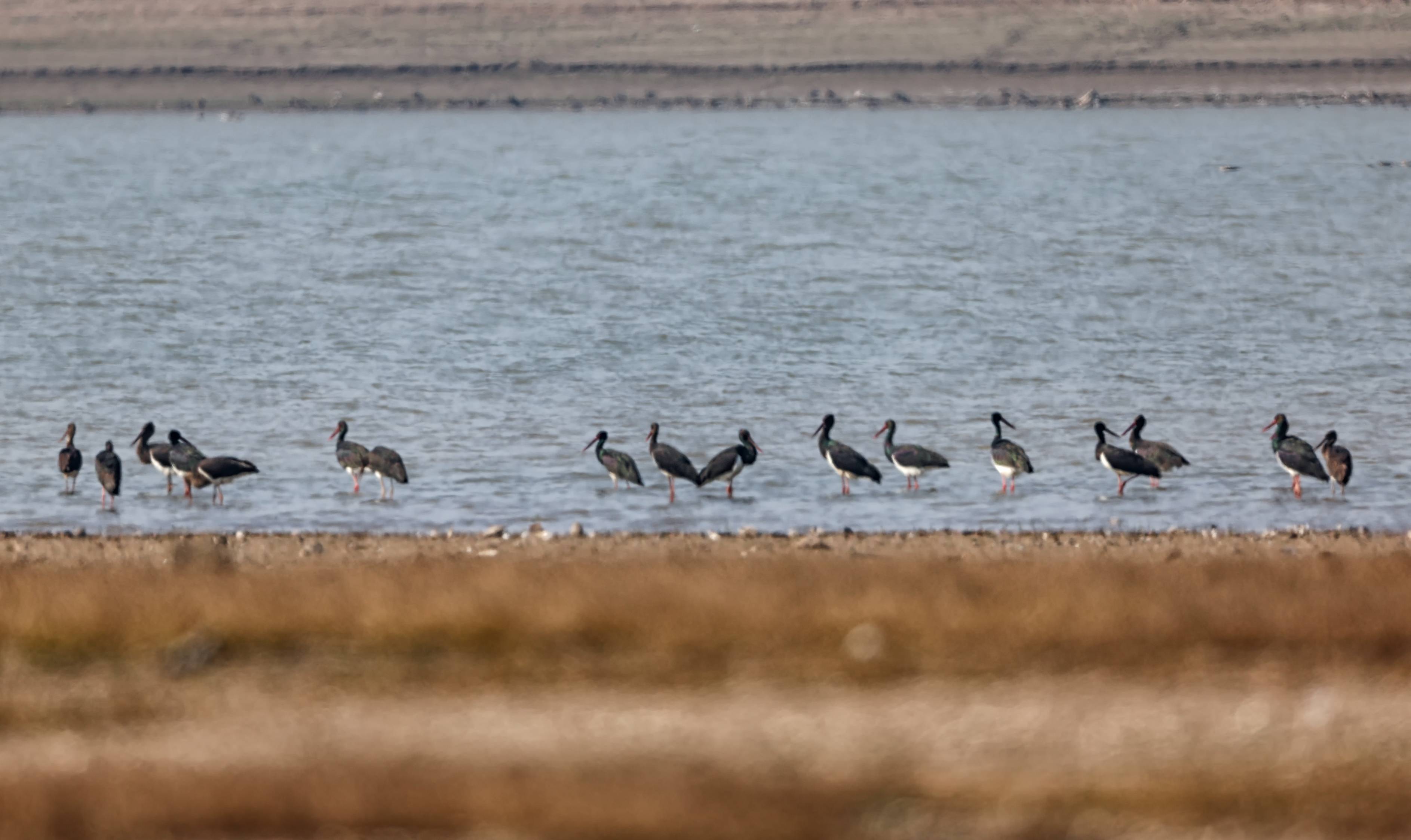 何王庙长江江豚省级自然保护区是全省127个越冬水鸟同步调查地点之一,湖北省林业局组织专家赴监利市现场指导,确保调查科学规范、数据准确。省林业局专家与监利市自然资源和规划局调查人员一起,早早地守候在何王庙保护区隐蔽处,记录水鸟情况。13日10时许,调查人员发现一群黑鹳飞临何王庙长江滩涂,数量达196只,它们时而悠闲地觅食,时而展翅飞翔,场面非常壮观。