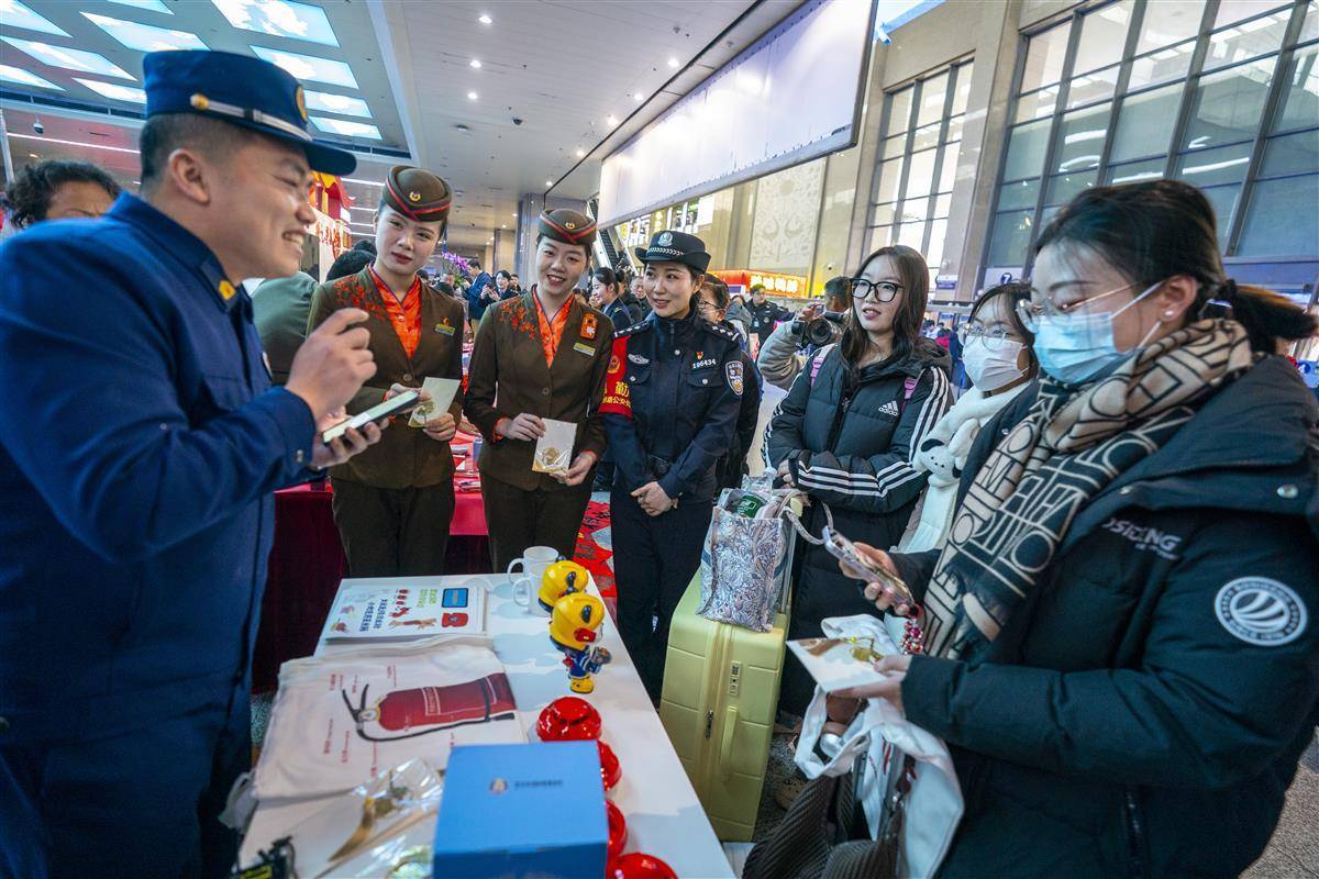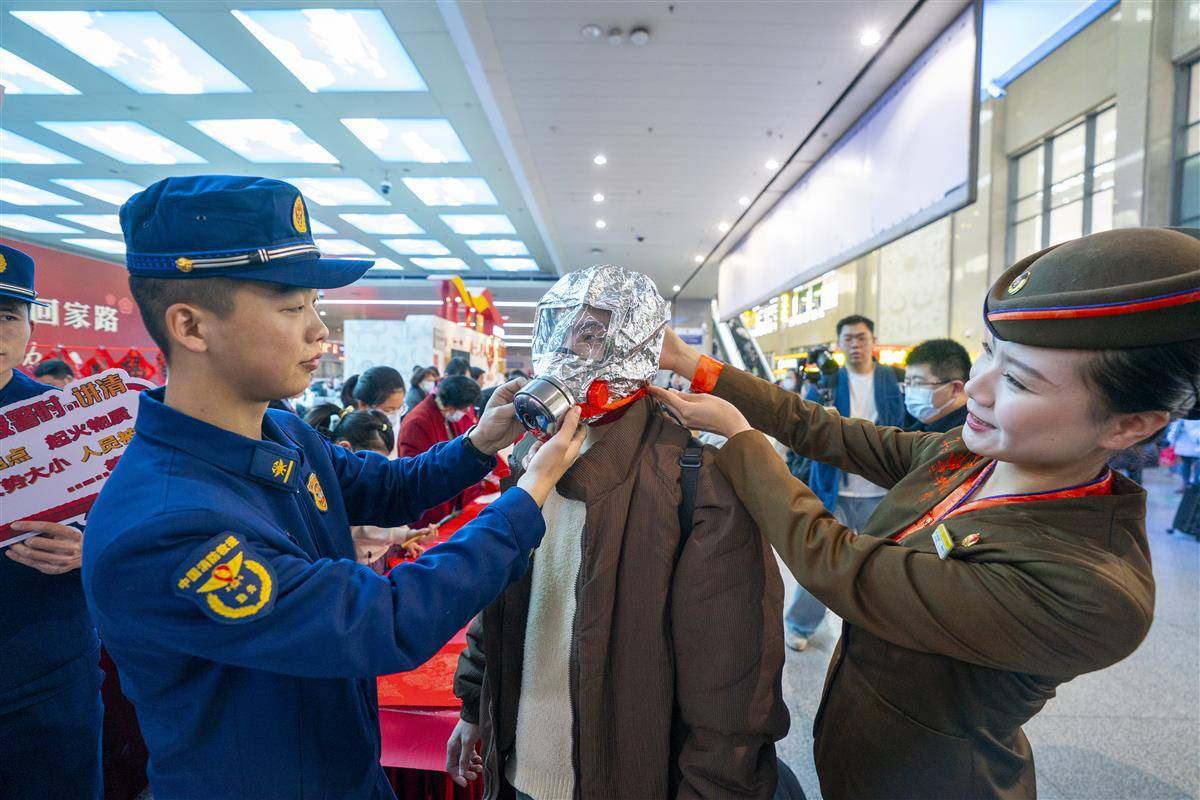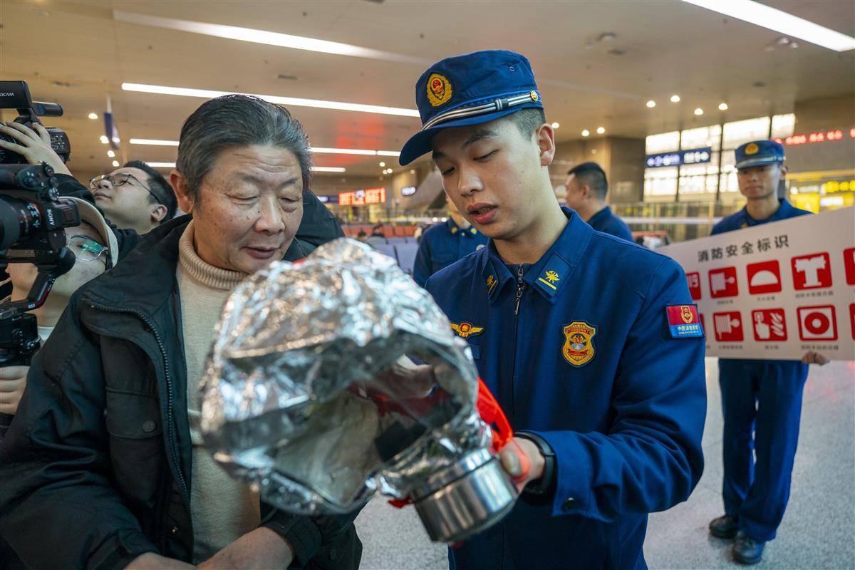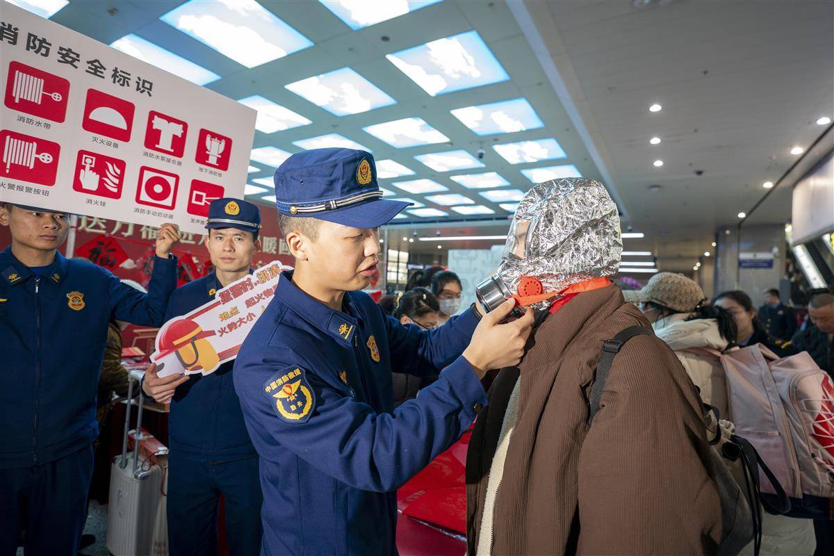 1月14日,武汉消防携手武汉铁路公安、铁路工作人员和高铁乘务员走进武昌火车站,开展“消防进家 平安过冬”消防安全知识宣传、培训及定点执勤活动,全力守护广大旅客的平安回家路。当天,2025年春运大幕正式拉开,武昌火车站一楼候车厅,旅客们正积极参与现场设置的消防安全知识有奖问答活动,通过现场答题,不少旅客从中掌握到了消防安全应急逃生知识及扑救初期火灾的方法。活动现场,消防员们还通过互动体验方式向候车的旅客讲解了灭火器、独立式烟感报警器及防烟面罩的正确使用方法,并针对冬季火灾高发的特点,细心为旅客们科普了居民家庭火灾的预防措施。(湖北日报全媒记者 魏铼 通讯员 李斌 摄)