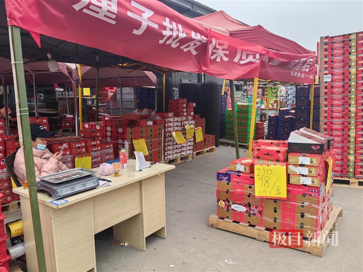 1月14日上午,记者来到位于汉口北的新华南果品批发市场,远远就能看到“智利车厘子,一件也是批发价”的大横幅在风中飘荡,目之所及都是堆得整整齐齐的车厘子礼盒。
