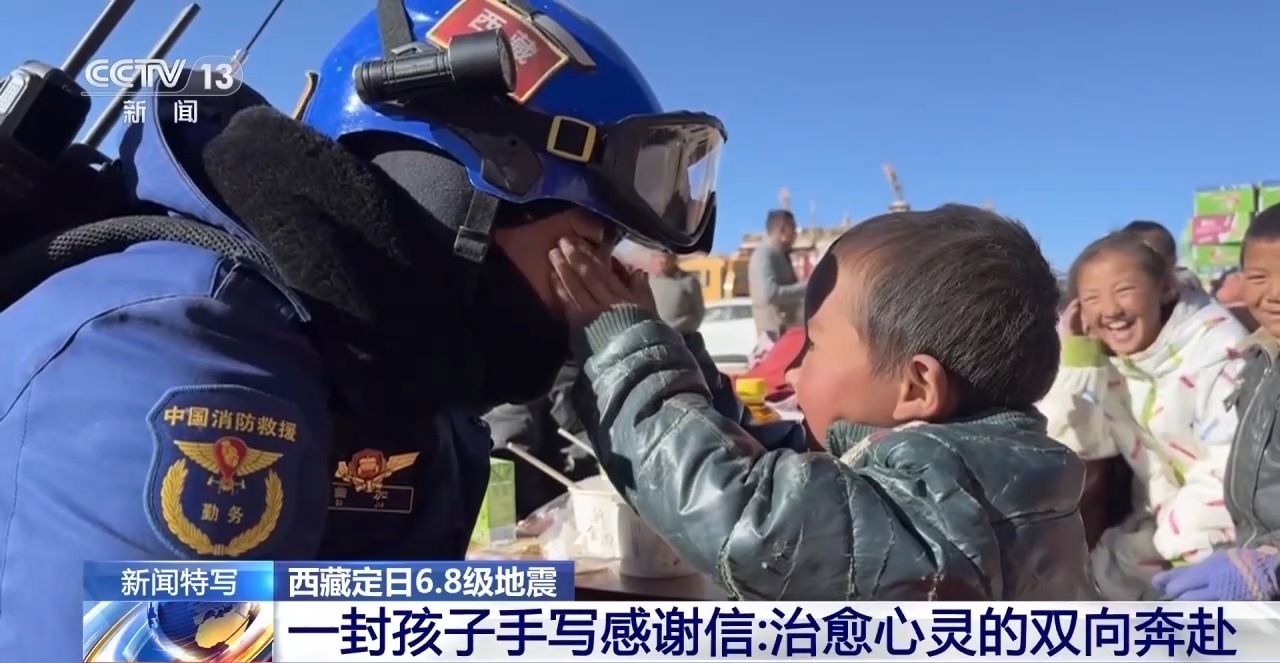西藏森林消防总队教育宣传处助理员 郑龙:能感觉到孩子在地震里受到的惊吓正在慢慢减少,还会主动过去找消防员玩,主动“受领任务”,帮忙搬运物资。