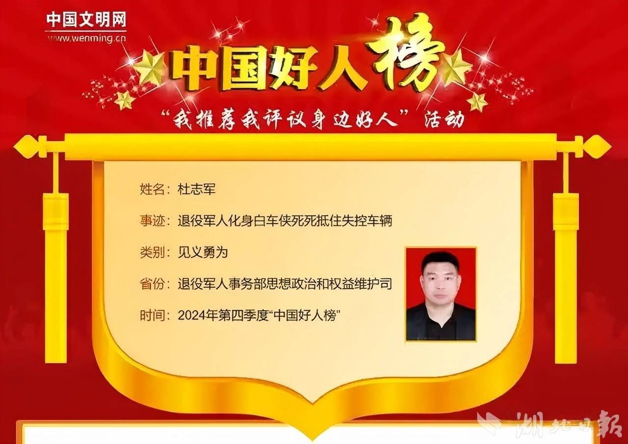 此前,“白车侠”杜志军荣登中央政法委2024年第四季度见义勇为勇士榜,获评咸宁市2024年度见义勇为先进个人,并被补选为通城县人大代表。