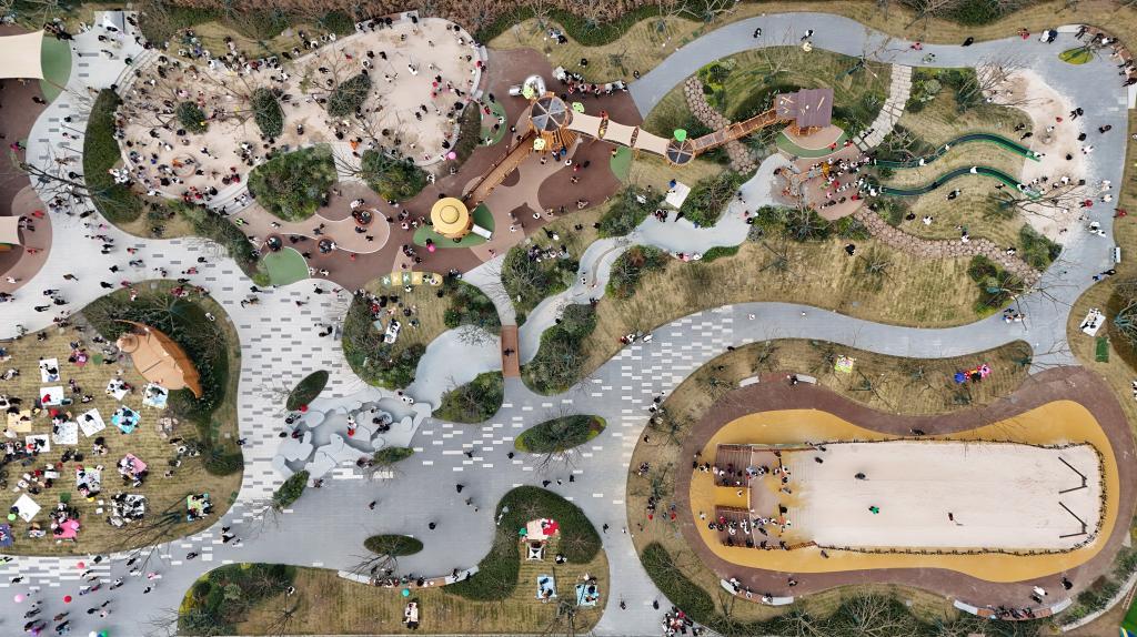 2025年1月5日,人们在位于成都天府新区的卡皮巴拉主题乐园玩耍(无人机照片)。四川成都将时尚潮购、品质生活、川味烟火等消费需求与全域消费资源相匹配,形成多元消费空间组合,推动多样化的消费场景加速创新升级,以满足消费者的需求。(新华社记者 刘坤 摄)