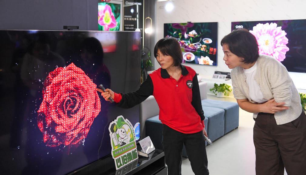 2024年10月17日,消费者(右)在位于重庆市江北区的京东电器超级体验店了解电视产品。(新华社记者 王全超 摄)