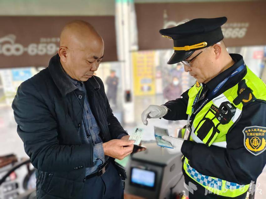 “师傅,您好!我是武汉经开区交通运输综合执法大队的执法人员刘强,这是我的执法证件,请出示您的道路运输证和从业资格证!”当天一早,武汉经开区执法人员就来到汉阳客运中心执勤点。证件查验完毕后,刘强提醒司机不要超载,注意行车安全。