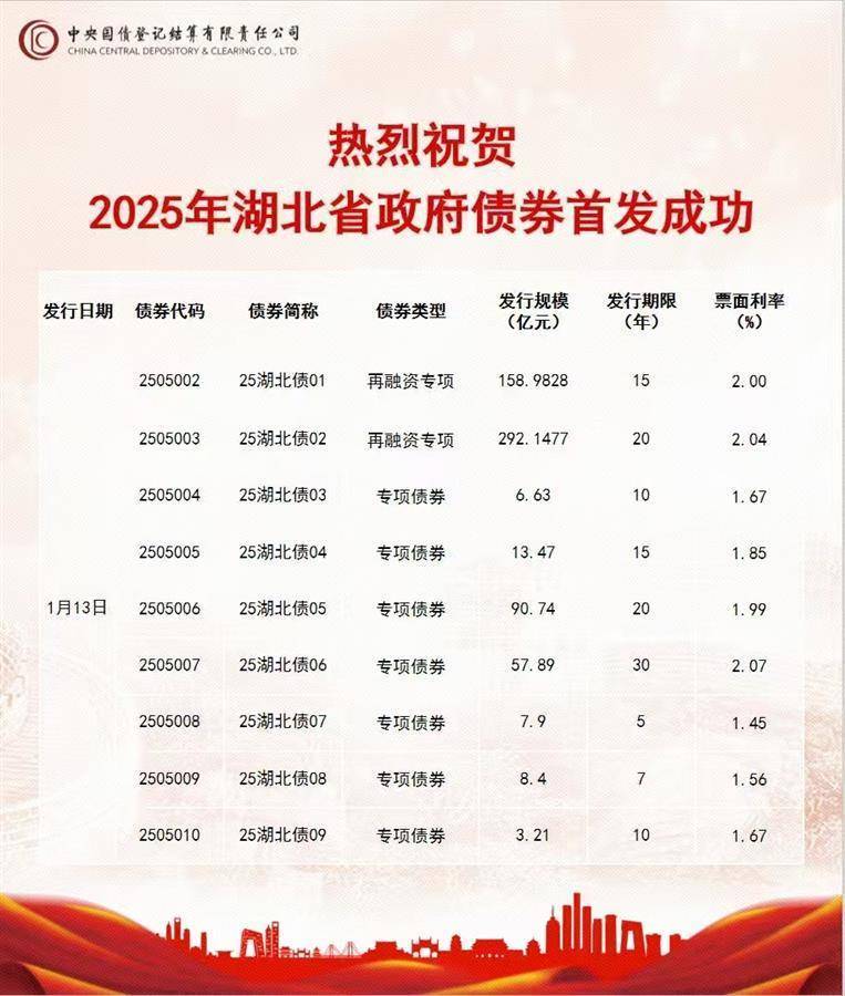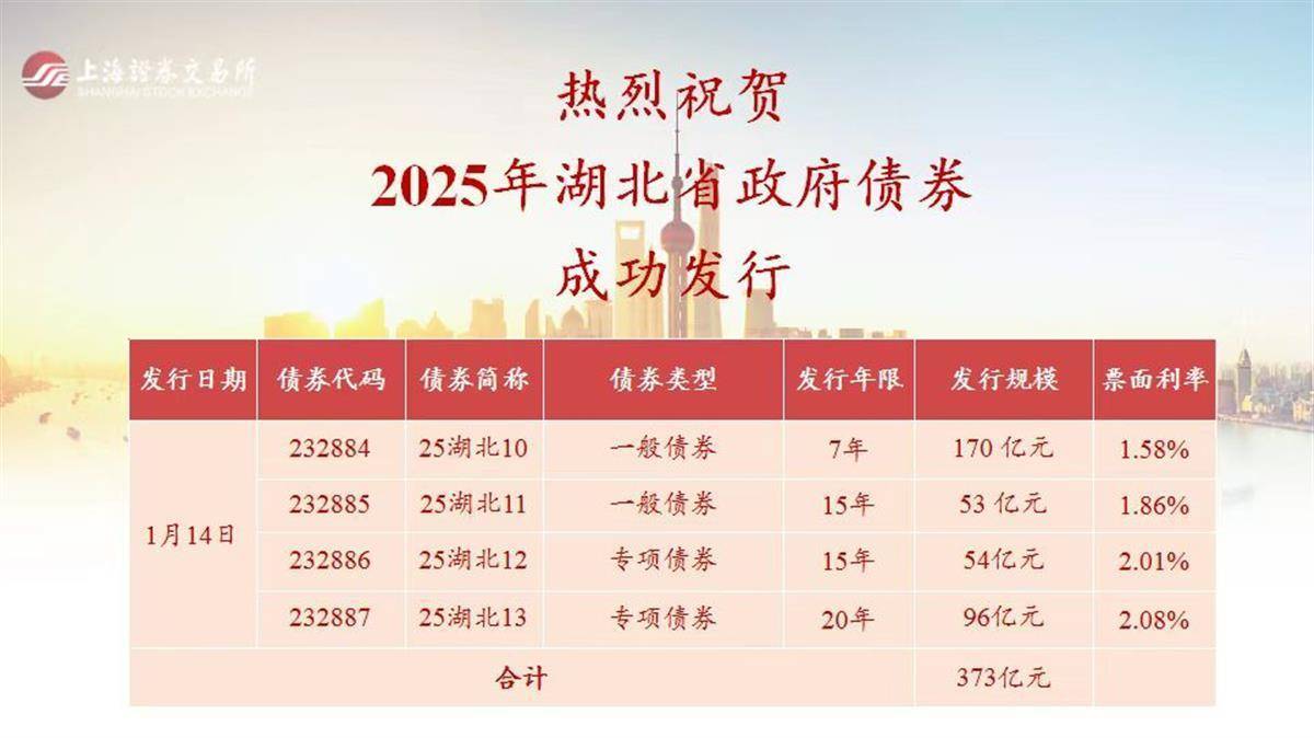湖北日报讯(记者张爱虎、通讯员杨洋、孟雨秋)1月13日和14日,湖北省在上海通过公开招标方式成功发行2025年首批地方政府债券1012亿元,包括新增一般债券223亿元、新增专项债券338亿元、再融资债券451亿元。湖北成为2025年全国首个发行地方政府债券的省份。