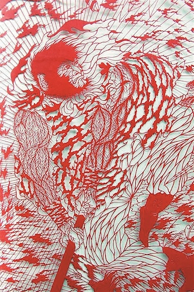 该作品大量使用阳剪镂刻工艺,力求精确、细腻、自然、流畅、生动,作品图案整体连接,凸显了剪纸“千剪不断,万刻不乱”的艺术特质,将剪纸“细纹连线”绝技发挥到极致。画面中疏密有序的细纹线条,层次分明,最细微处的线段长约3-5厘米,仅有0.1-0.2毫米宽。“这幅作品,涵盖了我之前所有作品中应用的技法和艺术领悟,可以说是自己所学剪纸技艺的总汇。”蔡骁龙说。