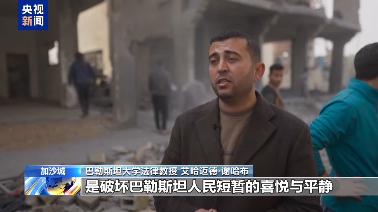 巴勒斯坦大学法律教授 艾哈迈德·谢哈布:我认为以军的目标是破坏巴勒斯坦人民短暂的喜悦与平静,尽管这份喜悦本就残缺不全。巴勒斯坦人民,无论男女老少都渴望停火。