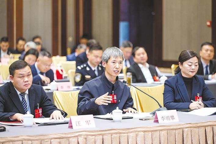 1月16日,黄冈市代表团审议省政府工作报告,省人大代表李明攀(左)发言。 (湖北日报全媒记者 任勇 摄)