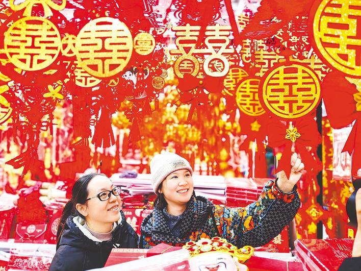 襄阳樊城国际商贸城内,市民在挑选新春饰品。 (湖北日报全媒记者 田悦 通讯员 张沛 谢勇 摄)
