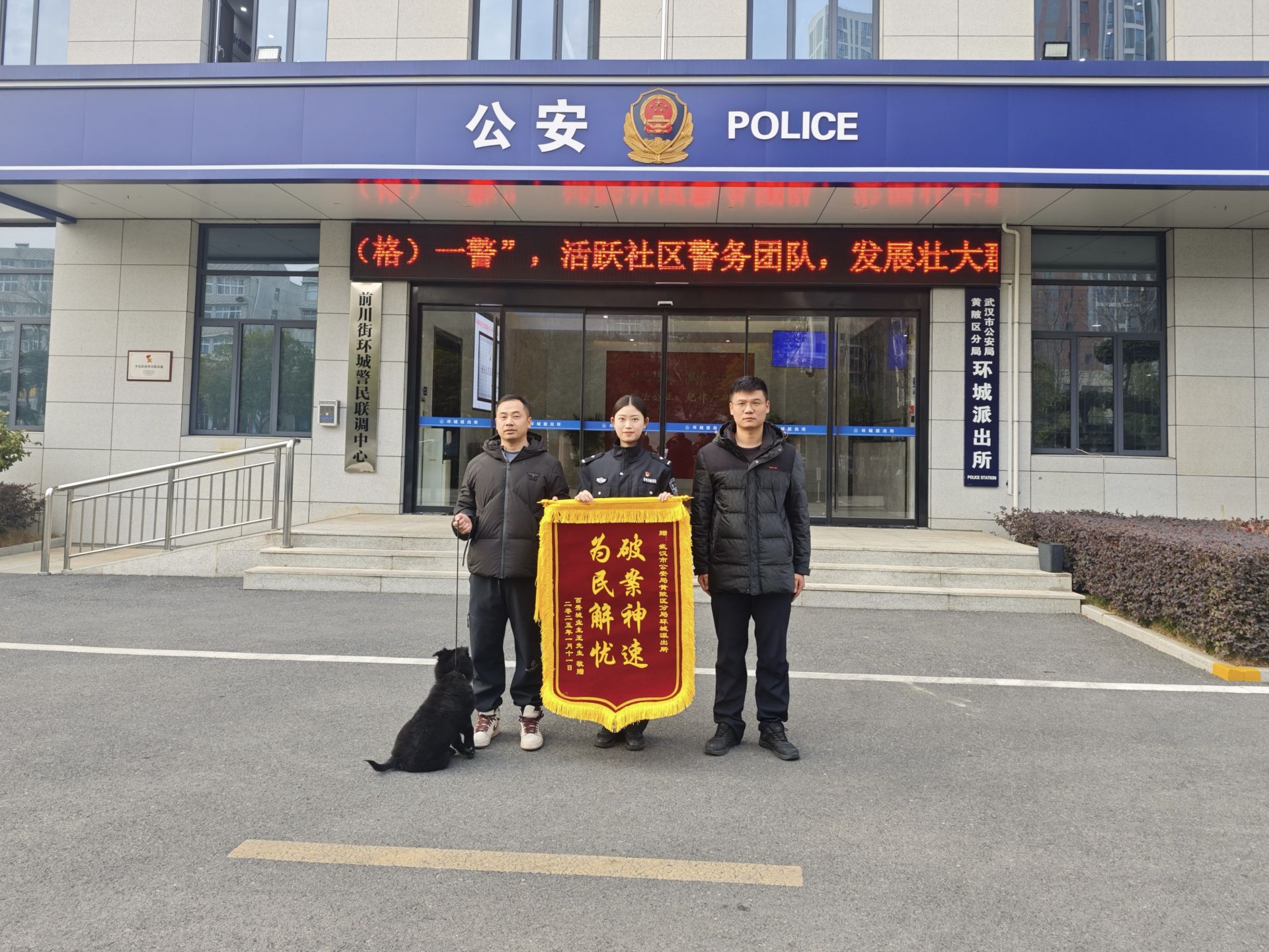 荆楚网(湖北日报网)讯(记者 白云 实习生 贺思源 通讯员 周剑波、汤文)“谢谢警察同志帮我找回‘黑仔’!”1月12日,家住武汉市黄陂区前川街的王先生专程带着爱犬“黑仔”来到武汉市公安局黄陂区分局环城派出所,将一面锦旗送给连夜帮他找回丢失爱犬的民警辅警,表达了深深的谢意。