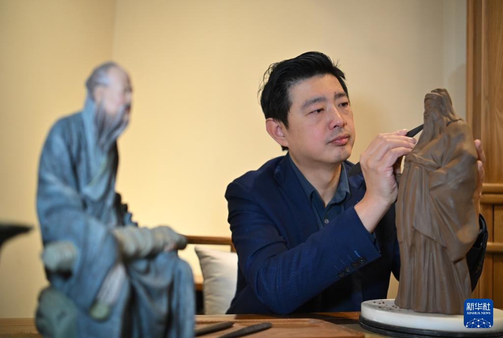 泥人张第六代传承人张宇在天津古文化街泥人张美术馆为新作品《福星》塑形(1月20日摄)。