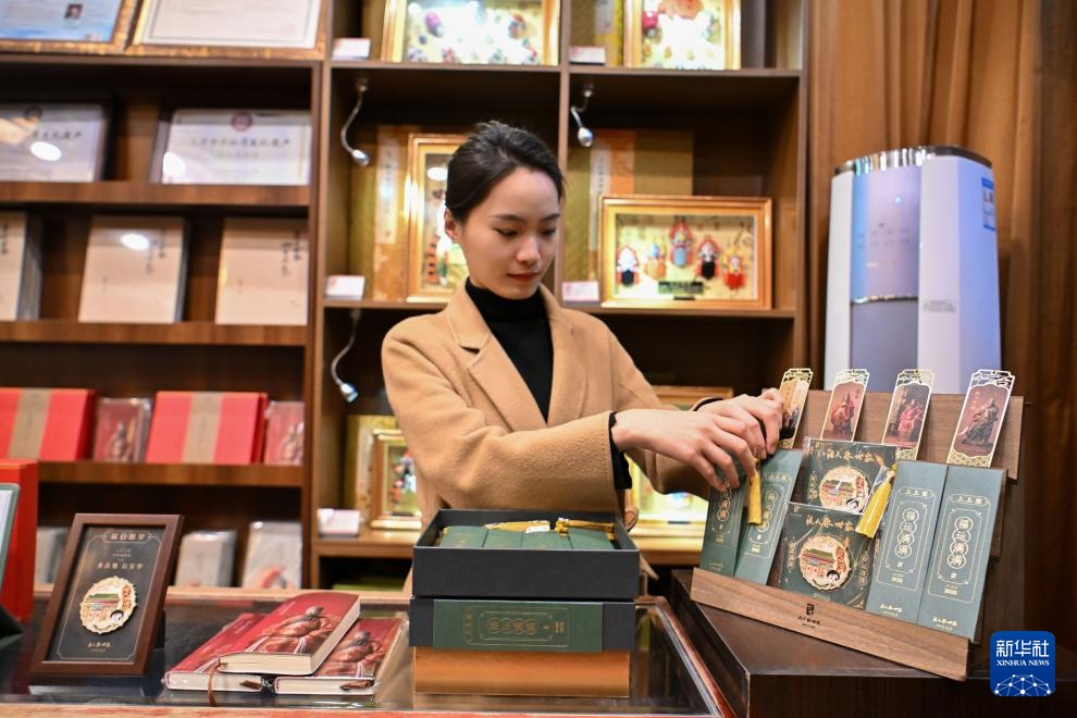 在天津古文化街泥人张世家,销售人员在摆放文创产品(1月20日摄)。