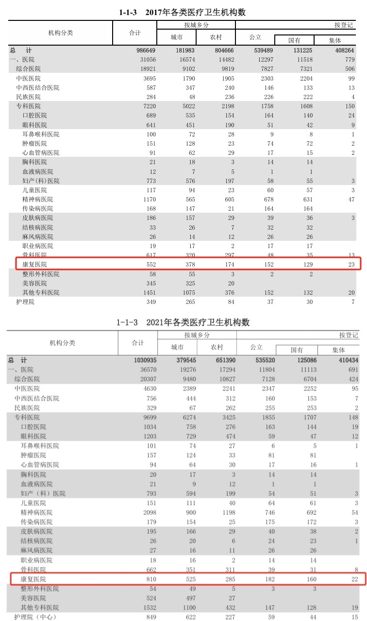 当然,这只是非公立医疗机构的一个缩影。根据国家卫健委发布的中国卫生健康统计年鉴数据,截至2017年,全国共有552家康复医院,公立康复医院为152家,到2021年时,全国康复医院数量达到810家,其中公立医院182家,4年间增加30家,显然,非公立医院数量增速明显快于公立医院。有分析指出,目前国内行业中非公立康复医疗服务机构优势明显且有效适配市场缺口,有望成为行业发展中坚力量。