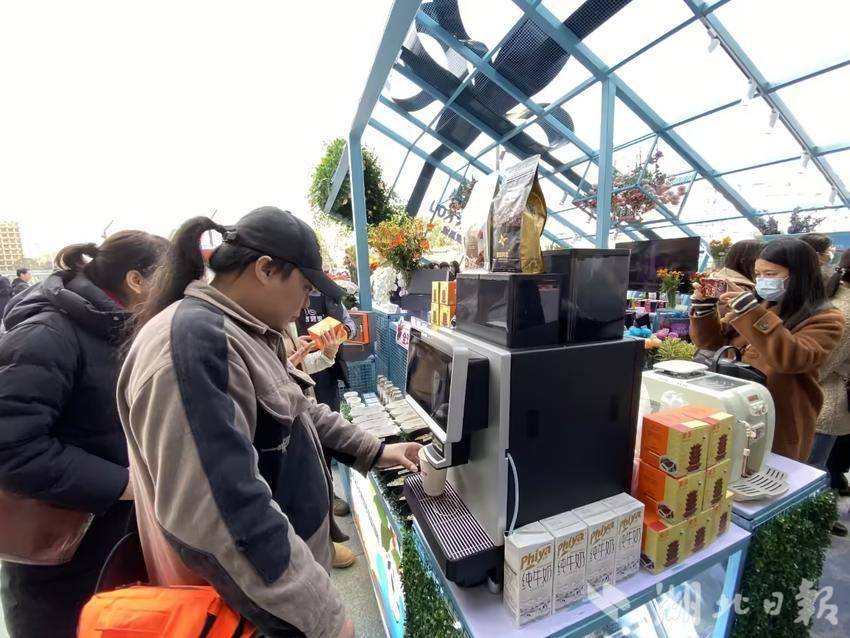 在武商梦时代“国潮好物市集”,不少市民在汉口北国际贸易城展区体验自动咖啡机。(湖北日报全媒记者 刘天纵 摄)