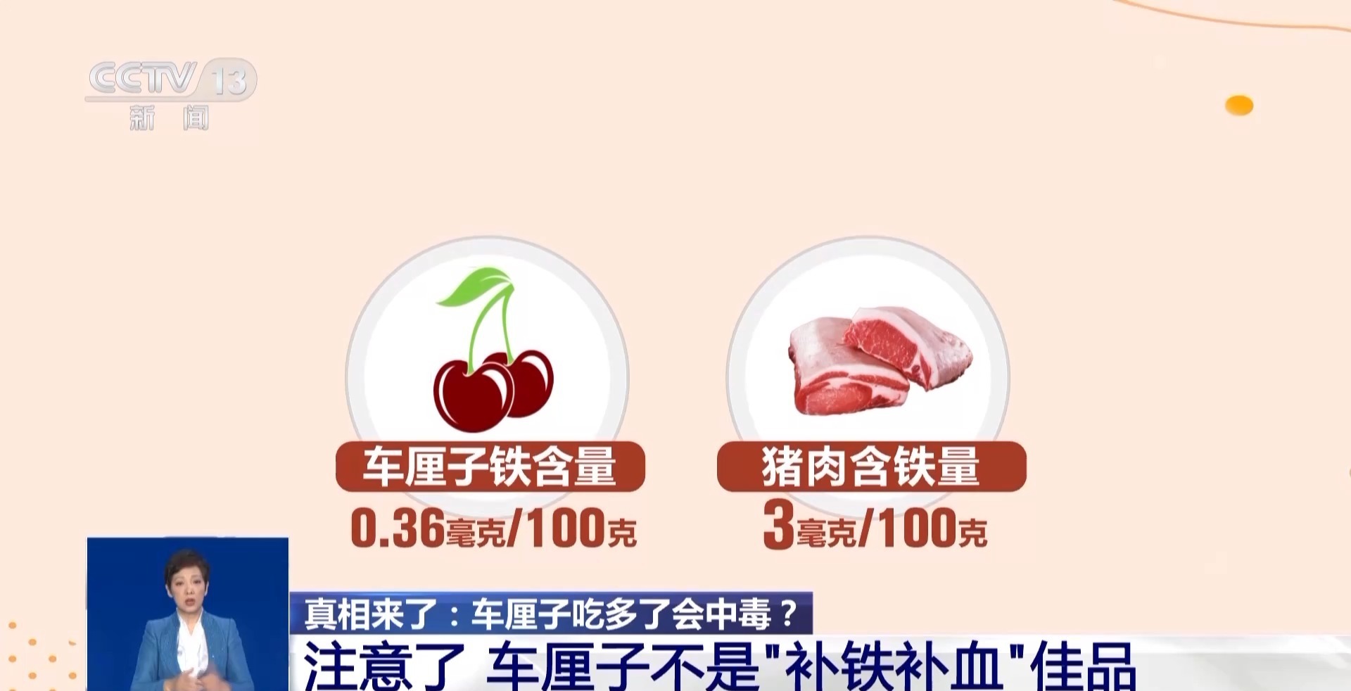 中华预防医学会健康传播分会常委 钟凯:虽然车厘子确实是有铁的,但是它的铁含量其实很低,和猪肝相比可能低了几十上百倍,吃猪肝都不会铁中毒,为什么吃车厘子会中毒?这是不可能的。如果你缺铁的时候,医生还会告诉你,建议你偶尔吃点猪肝可以补铁,实际上铁中毒仅见于比如说吃补铁剂,吃多了吃错了,有可能导致,吃食物是不会的。