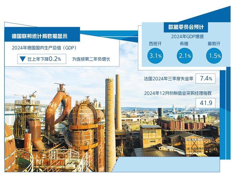 德国联邦统计局1月15日公布的数据显示,2024年德国国内生产总值(GDP)比上年下降0.2%,为连续第二年负增长。作为欧洲经济“火车头”、拥有众多“隐形冠军”企业的德国经济接连失速,增加了市场对欧洲经济前景的担忧。而经济表现相对亮眼的南欧国家能否拉动欧洲经济重回正轨,仍有待观察。