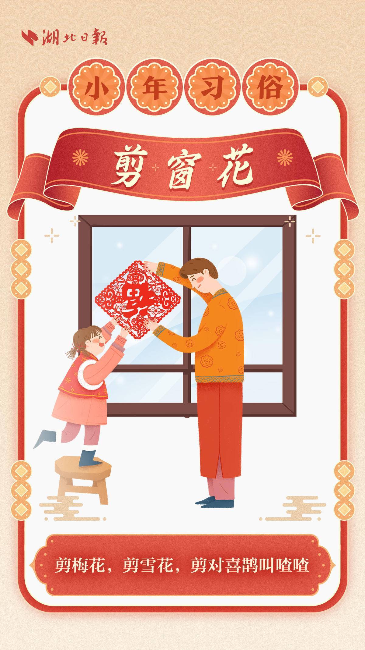 剪窗花、贴窗花是小年较盛行的民俗活动。心灵手巧的艺人们,用一剪一刀,在红彤彤的纸上刻画出对新年的向往。