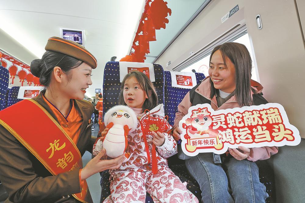 1月21日,农历小年前夕,在十堰开往襄阳的G6818次列车上,襄阳客运段工作人员为旅客送上祝福。