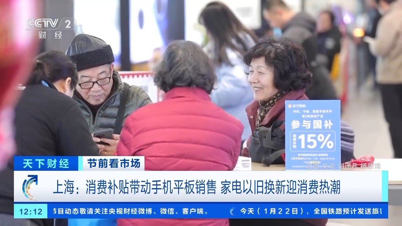 1月19日,上海同样发布手机、平板、智能手表(手环)购新补贴及家电“以旧换新”补贴细则。在杨浦区的一家电器卖场记者了解到,消费补贴吸引了众多消费者来到卖场询问和选购。