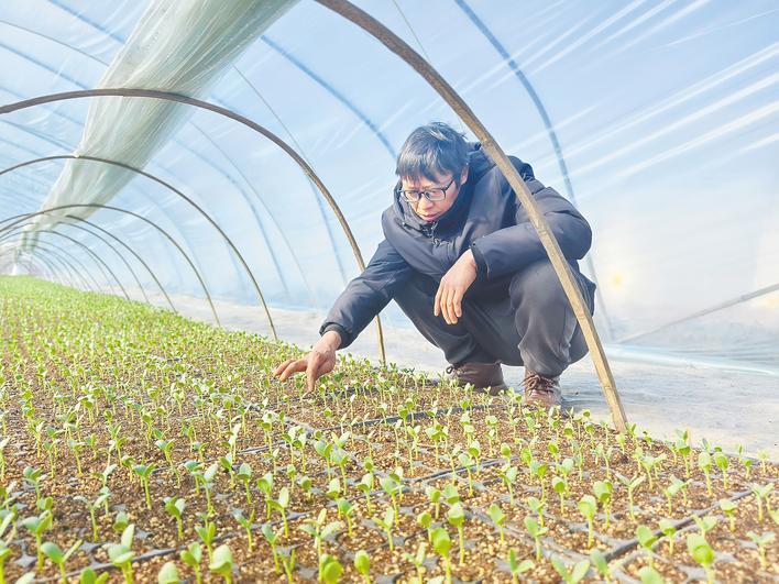 吴成亮在大棚里察看瓜苗。 (湖北日报通讯员 但唐静 摄)