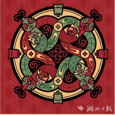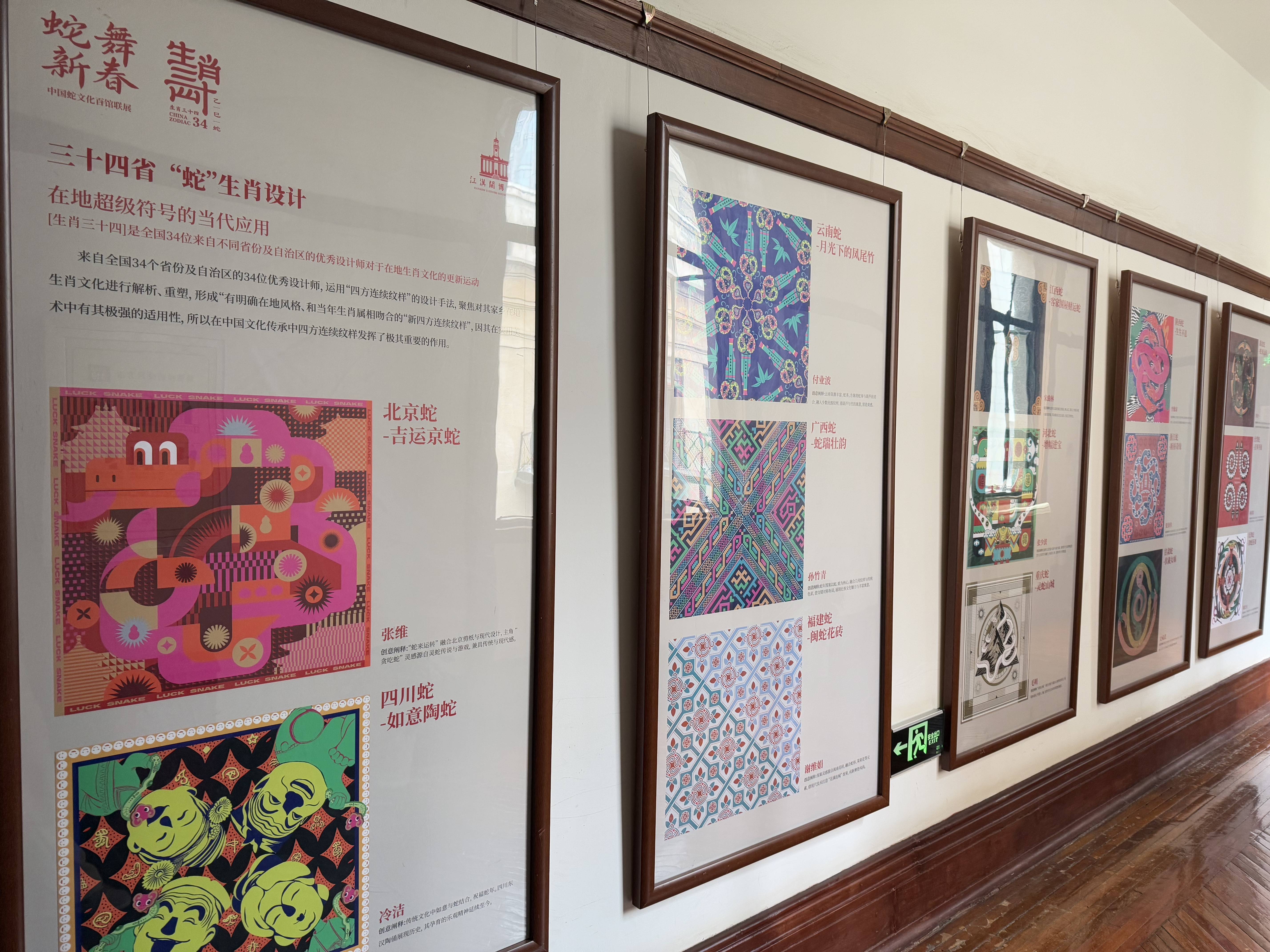 值得一提的是,江汉关博物馆还在此次展陈中对蛇年生肖文化进行了现代表达。来自全国34个省、自治区、直辖市及特别行政区的34位优秀设计师,运用“四方连续纹样”的设计手法,聚焦当地生肖文化解析、重塑,形成有明确在地风格的“新四方连续纹样”,对中华传统生肖文化进行创造性转化和创新性表达。如“湖北蛇”纹样,以荆楚文化为灵感,蛇形纹构成金币,与凤鸟结合,集多种纹样,借编钟、底纹及特色配色,传达新年祝福。