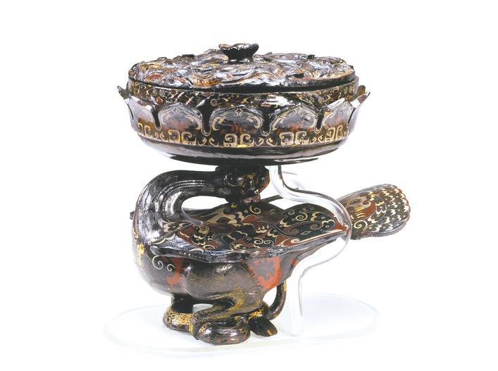 战国 漆木彩绘凤鸟莲花盖豆。荆州博物馆藏