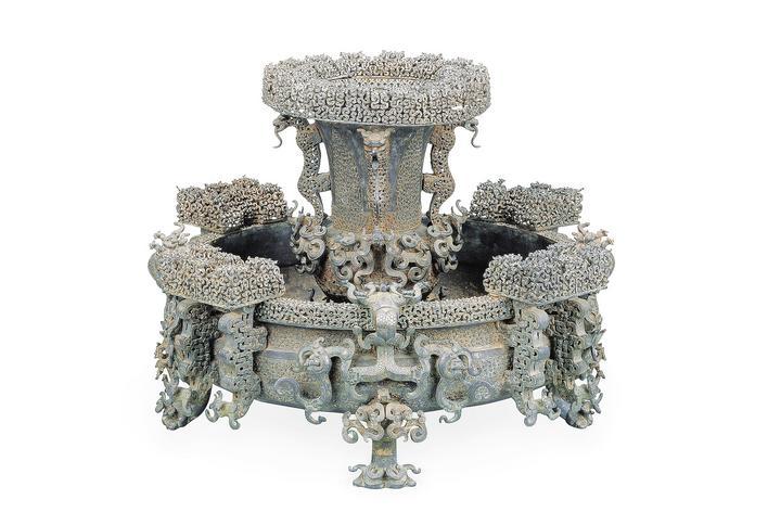曾侯乙墓出土的多件重器是其中的代表——曾侯乙尊盘的口沿处,是由无数条龙蛇组成的镂空花纹,相互盘旋环绕;被誉为“古代冰箱”的铜鉴缶,饰蟠螭纹、蕉叶纹、涡纹等,繁复华丽。
