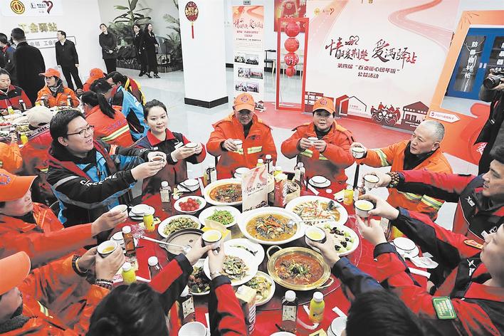 环卫工人、快递小哥们一起吃年饭 李罗亮摄