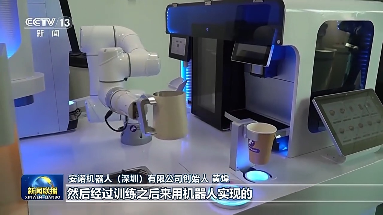 安诺机器人(深圳)有限公司创始人 黄煌:这些都是我们提前通过捕捉好咖啡师的动作,然后经过训练之后来用机器人实现的,我们牛奶都将近用了三吨左右。