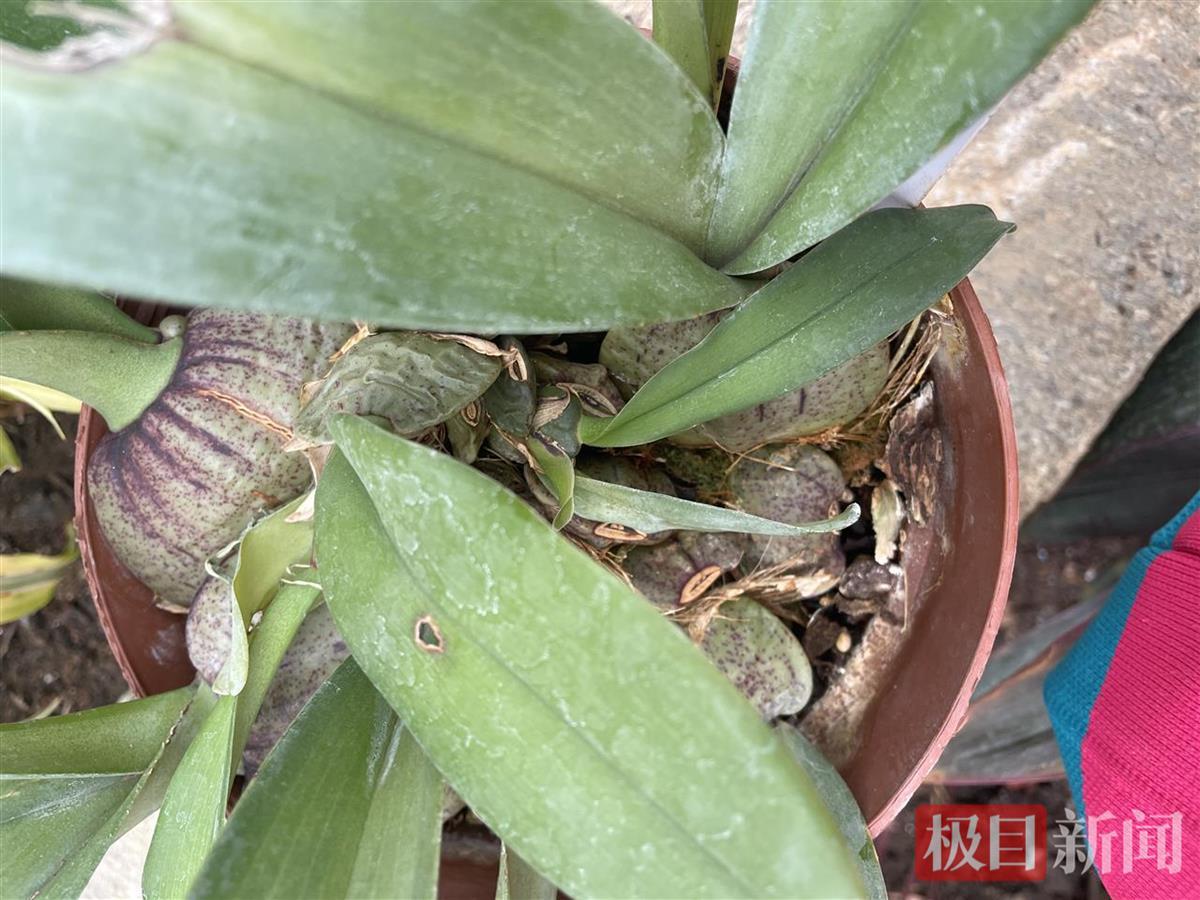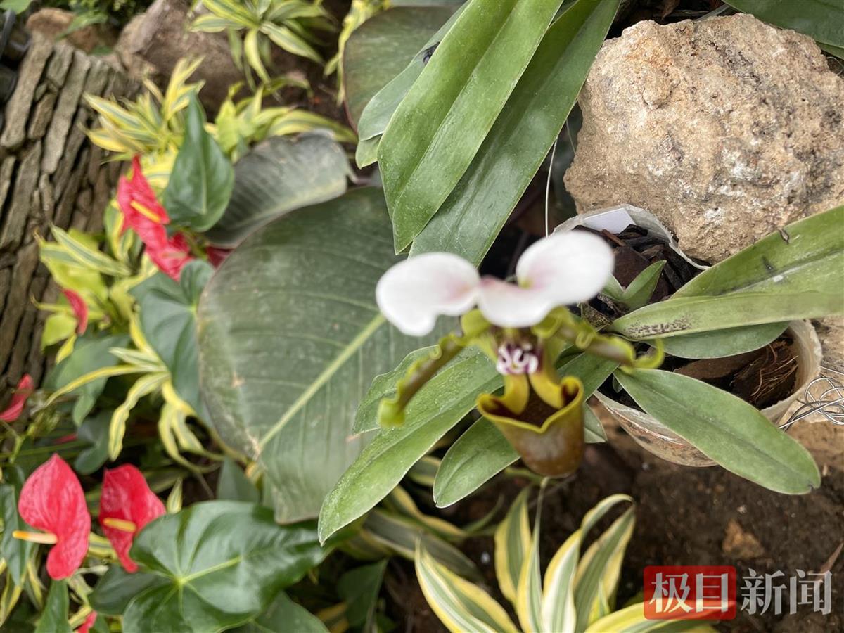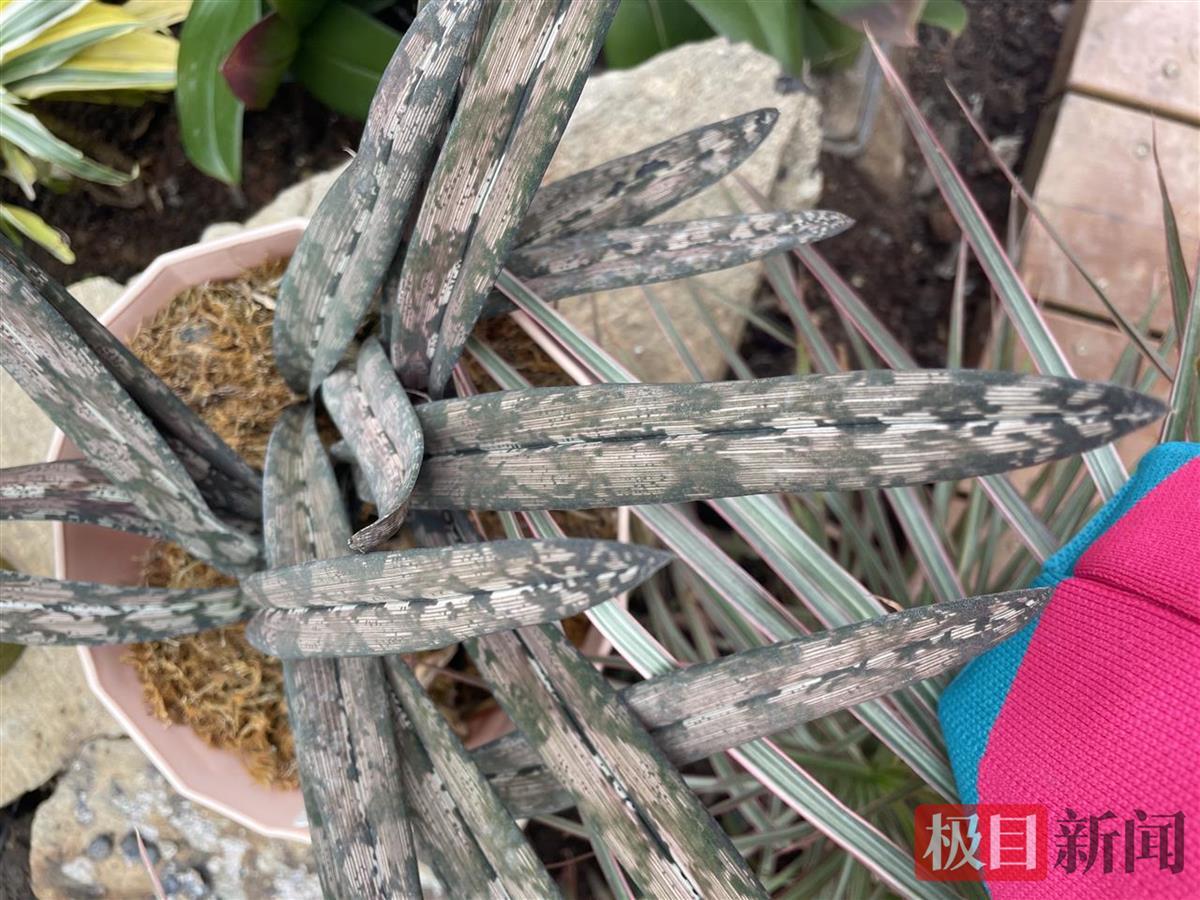 还有一盆绿植,没有开花,很多游客询问工作人员后才知是珍品。杨福勇解释,这就是龟背兰,也是文心兰的一种,珍稀濒危植物,全国植物园少见,其假鳞茎像龟背,花形也似乌龟。