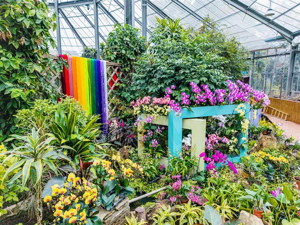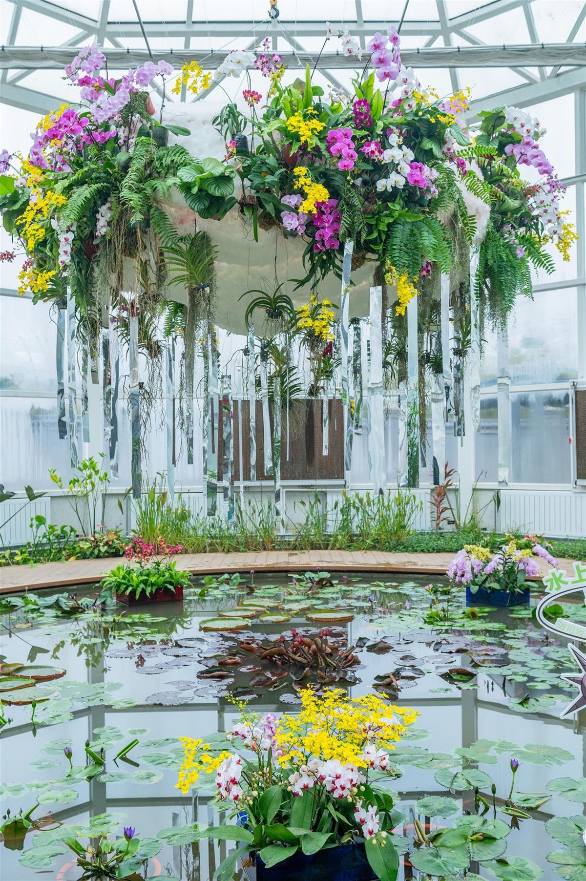 温室内绿意葱茏、流水潺潺,热带兰在绿植的衬托下分外娇艳,姿态各异的兰花和各种热带植物交织出生机勃勃的美好“兰”图。