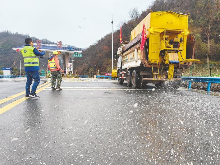 湖北交投鄂西北运营公司窑淮管理所撒布机正在进行融雪剂撒布作业。 (湖北日报通讯员 金伟忠 贺永 姜谷平 摄)
