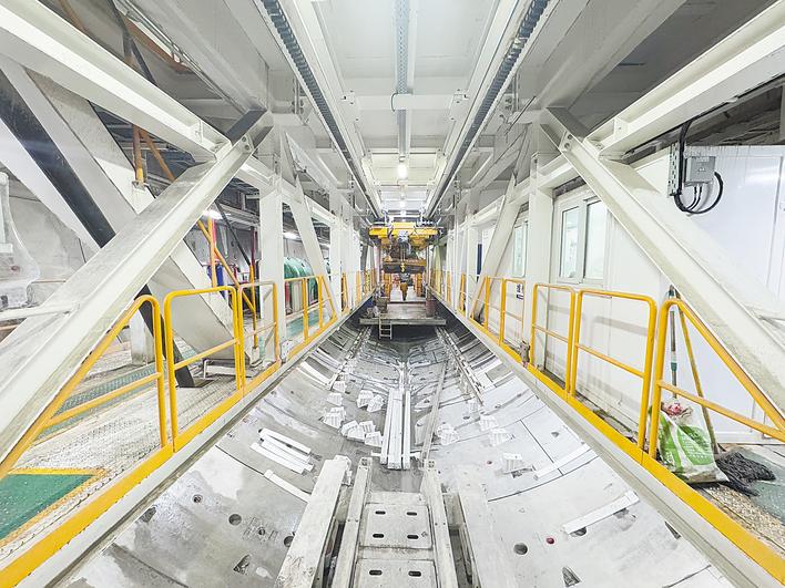 掘进机前行1.8米后,吊车便抓起十几吨重的弧形预制管片,开始拼装。“管片相当于隧洞的防护罩,过去是洞内施工,现在改为提前预制,现场安装。”该工区经理丁少明介绍,每环预制管内直径10.4米、宽1.8米,“江汉先锋号”能实现隧洞掘进和管片拼装同步推进,施工效率较过去提升20%至40%。