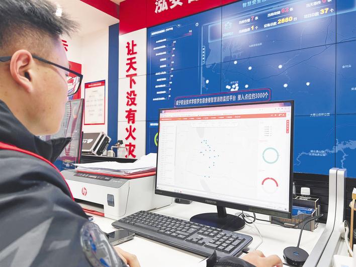 咸宁市火灾监测预警中心,工作人员24小时值班,一旦收到预警信息,便可通过电脑或手机远程处理。(湖北日报全媒记者 童晨曦 摄)