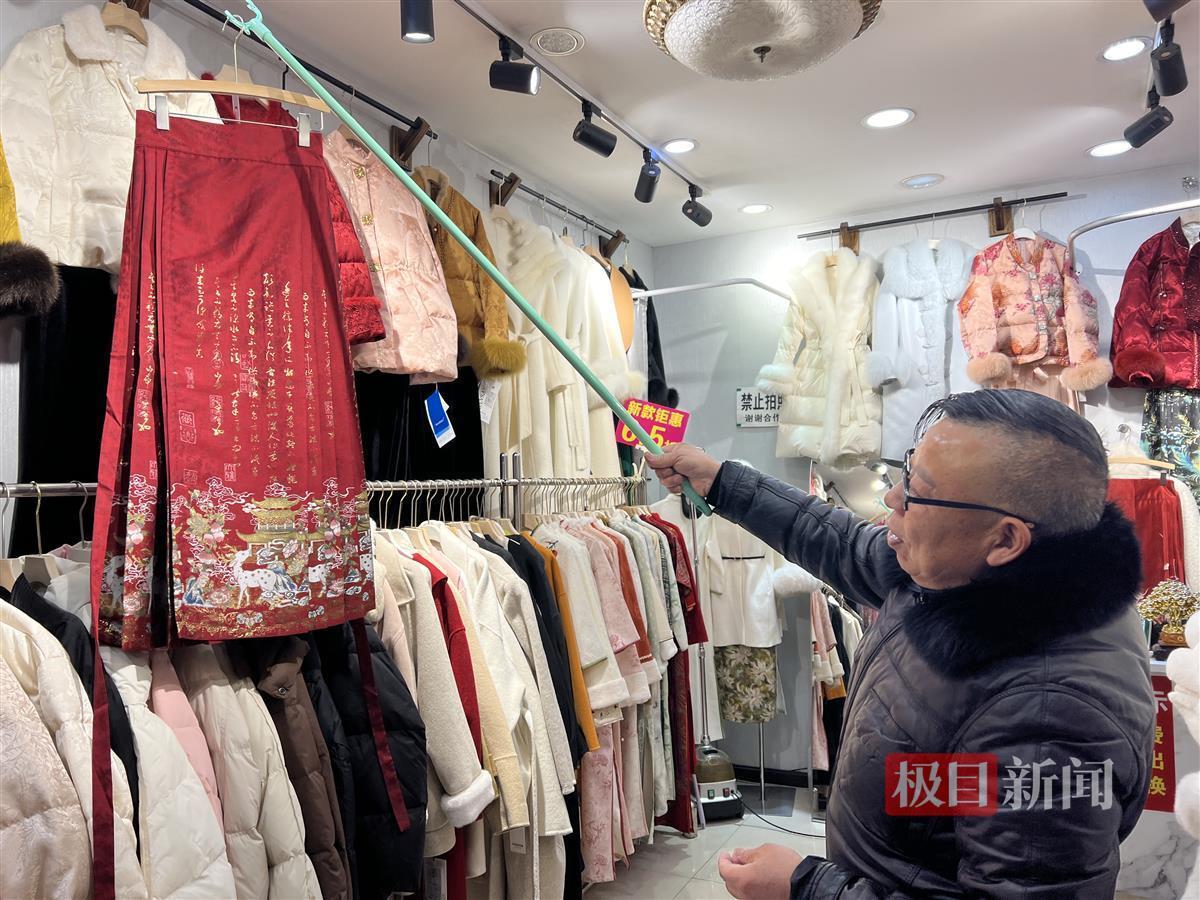 新年到,穿新衣,戴新帽。腊月二十七,人们购置春节新衣的热情持续高涨。1月23日,在湖北襄阳襄城区北街,盘扣棉服、印花马面裙、“新中式”羽绒服等国潮风女装,吸引着高中生、年轻情侣和中年女性的喜爱。