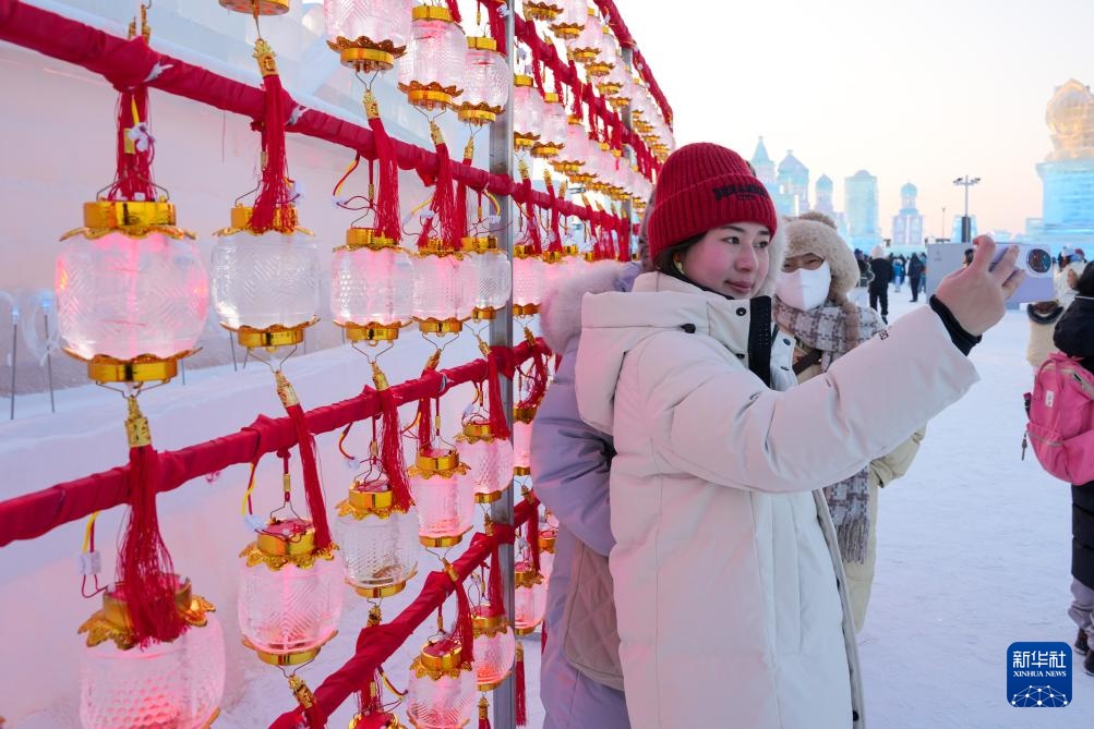 游客在哈尔滨冰雪大世界园区内拍照留念(1月23日摄)。