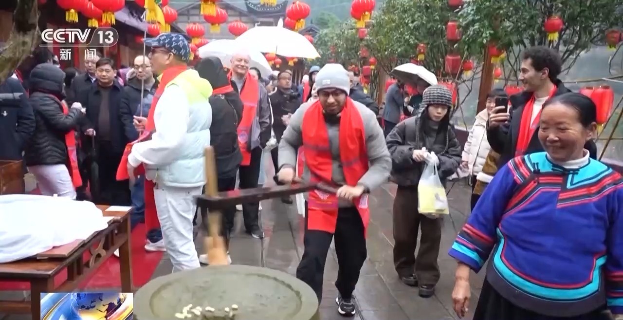 在土家族山寨里,房前屋后挂满了红色灯笼,土家儿女穿上盛装、唱起山歌、舞龙舞狮、给中外游客献上吉祥如意巾,迎接他们的到来。现场,打糍粑、写福字、包饺子、炒米、炸油豆腐、印刷木版年画等各类体验项目丰富多彩。在土家族习俗中,过年少不了推豆腐,不少外国游客轮流上前,推动沉重的石磨,感受从黄豆到豆浆的神奇变化,新鲜出炉的豆腐脑也让他们赞不绝口。