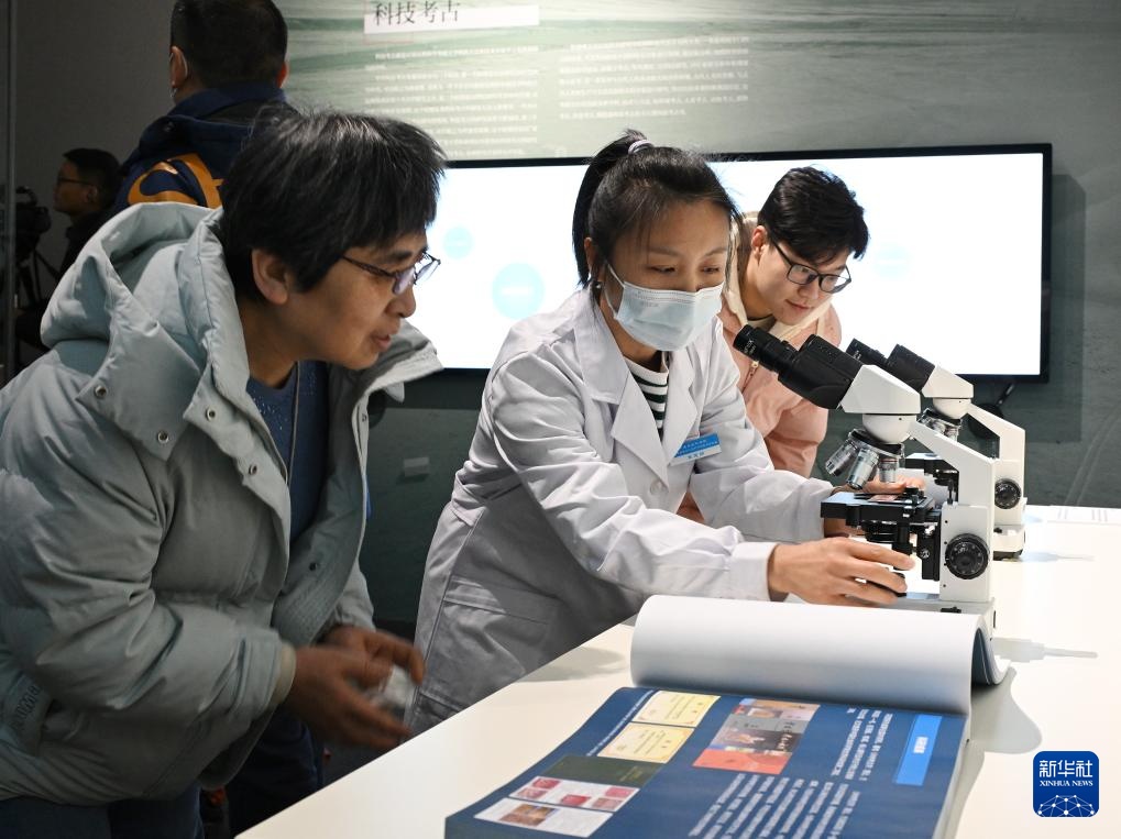 1月27日,一位文化遗产保护实验室工作人员(中)向参观者介绍实验室观察设备。