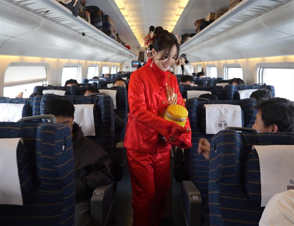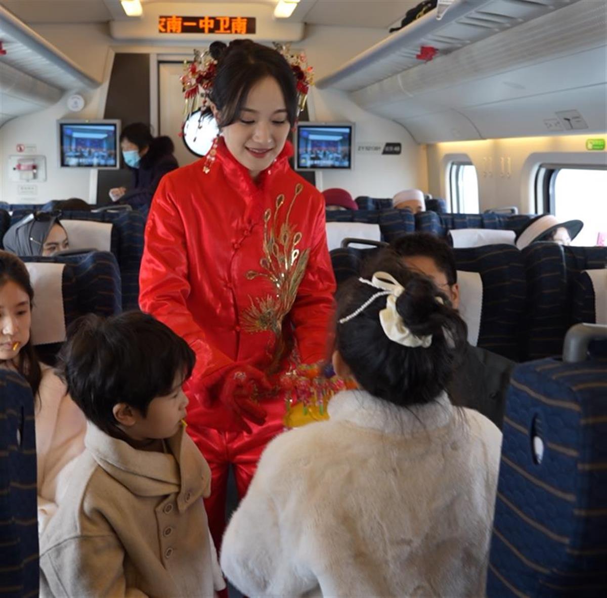 近日,因大雪来袭,宁夏银川的一位新娘乘坐高铁赶赴婚礼现场,新娘身穿红色婚礼服,在车厢里给乘客分发喜糖,画面喜庆而温馨。