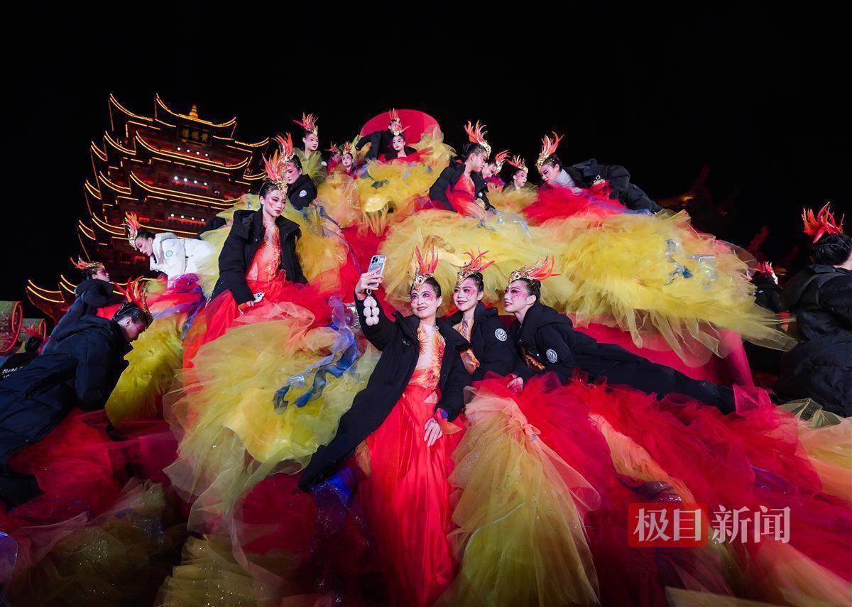 录制前夕,饰演“凤凰”的姑娘们在黄鹤楼前留影