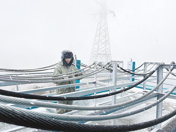 下午3时,荆门市圣境山巅四垭口区域雪花飞舞,220千伏爱南线51号铁塔岿然矗立。在它脚下,一座两层的观冰哨内,两名“90后”电网工作人员正时刻观察着铁塔的状况。