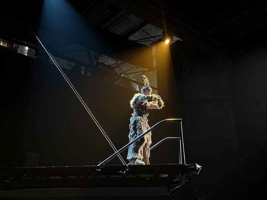 在《因为青铜》中,观众可以走进舞台布景搭建起的“铜绿山”,见证一场即将发生的大战:“楚王”为备战命令矿工赶制大批青铜剑。这些武器需要半年炼制,而楚国给出的时间只有30天。