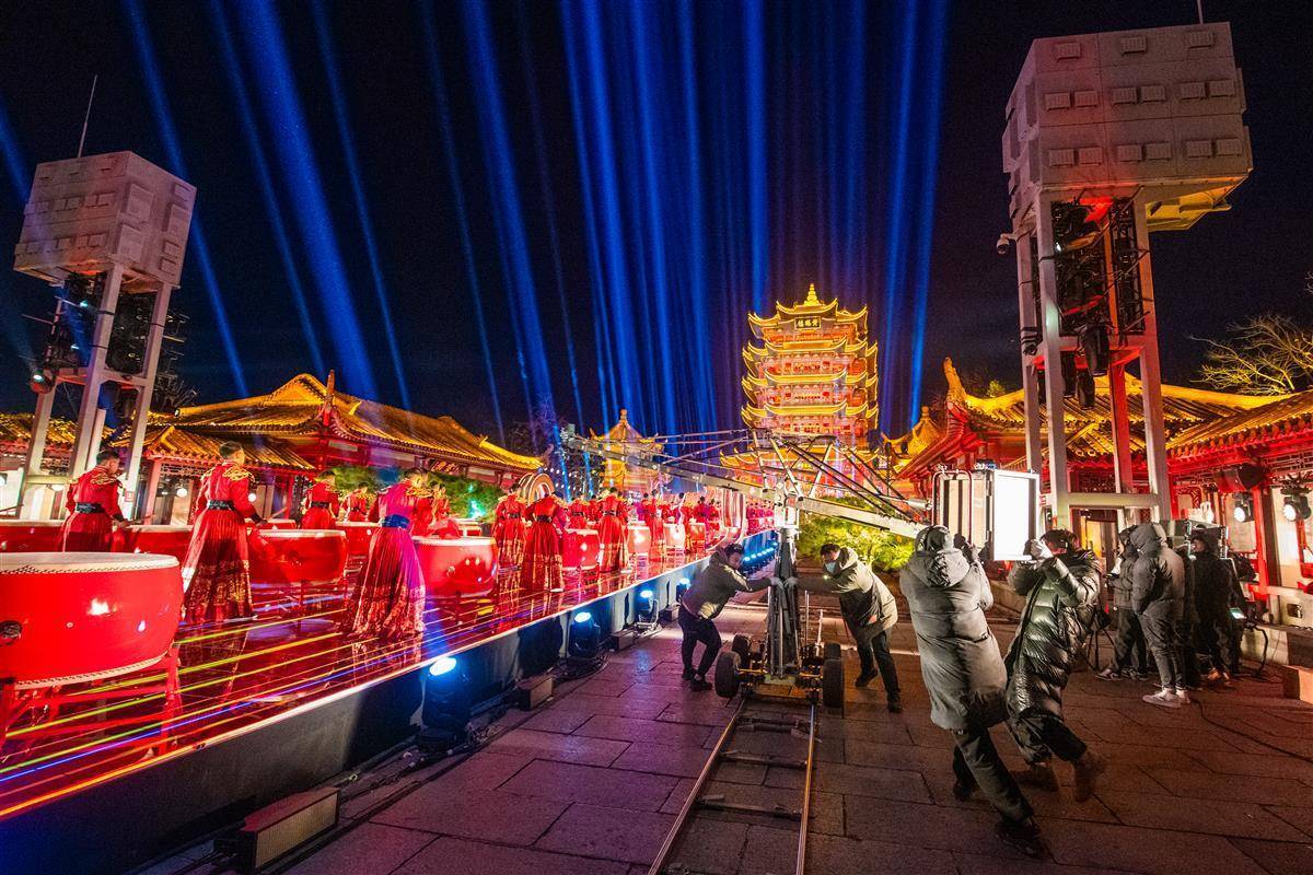 2025年1月9日凌晨,中央广播电视总台《2025年春节联欢晚会》武汉分会场节目短片在黄鹤楼主舞台紧张录制。经过近一个月改造和舞台搭建后,黄鹤楼焕然一新,如诗如画。(湖北日报全媒记者 何宇欣 摄)