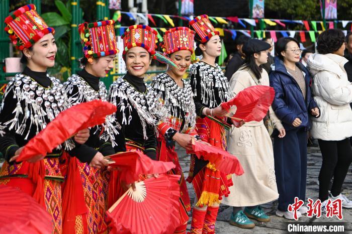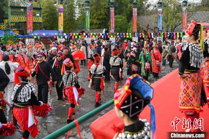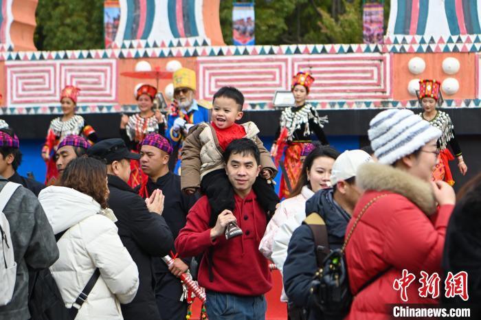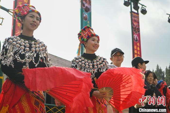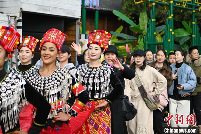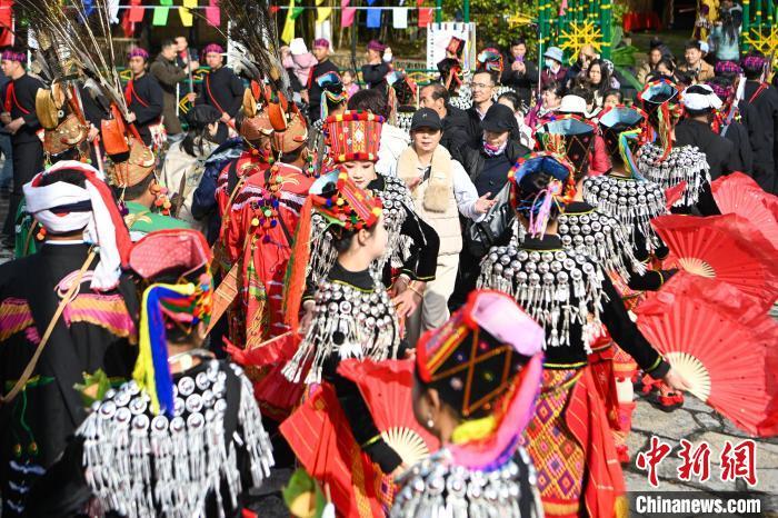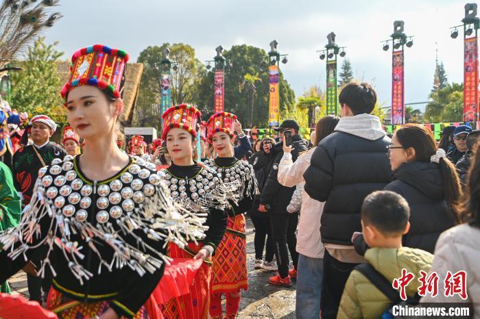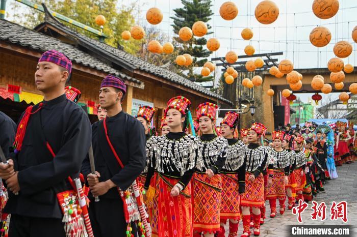 1月29日,云南昆明,队伍在民族村内巡游。当日是农历正月初一,云南民族村节日氛围浓厚,游客和景颇族民众一起踩着鼓点共跳有“天堂之舞”美誉的目瑙纵歌,感受景颇族节日文化、民俗风情。中新社记者 李嘉娴 摄
