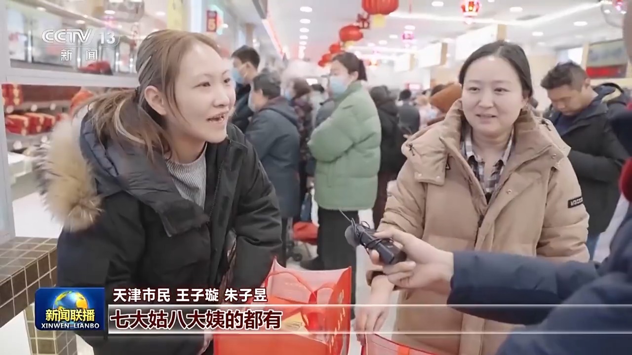 天津市民 王子璇、朱子昱:排了一个半小时买上的点心,送给七大姑八大姨的都有。从老一辈传下来的,也走个仪式感,这样才显示出过年。
